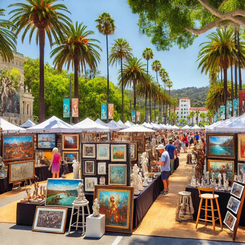 A prestigious outdoor art show in Beverly Hills featuring over 235 artists showcasing diverse original artworks in a scenic park setting