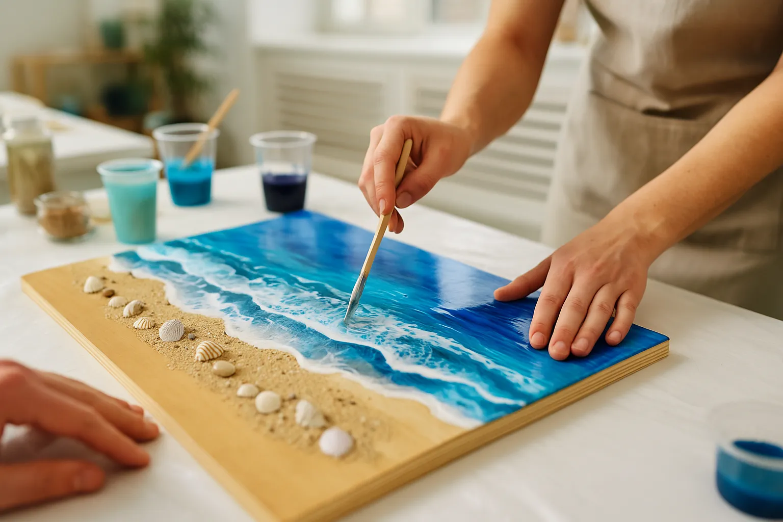 Craft a shimmering ocean scene on a wooden board using epoxy resin, sand, and seashells at this relaxing Windsor art workshop.