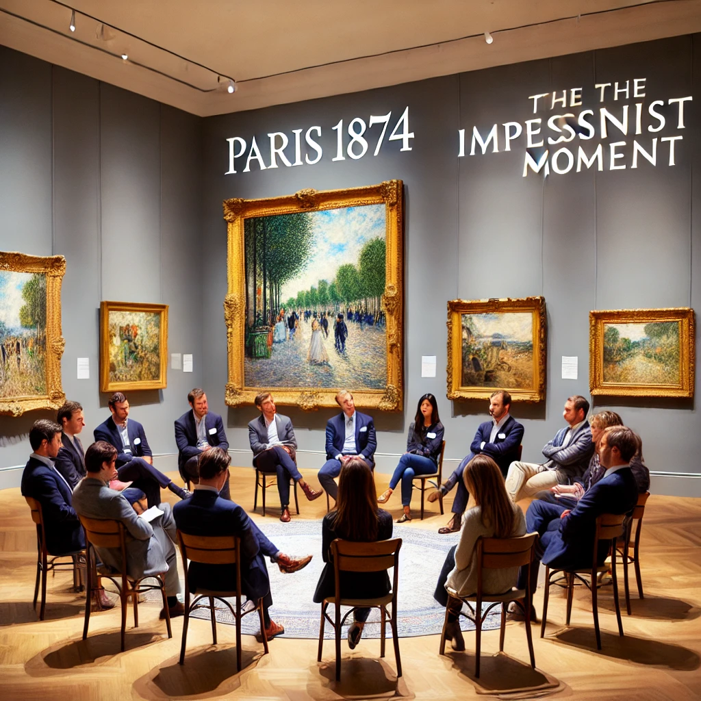 An informal discussion session focused on the "Paris 1874: The Impressionist Moment" exhibition. Participants are invited to share their thoughts, ask questions, and engage in dialogue about the works and themes presented in the exhibition.
