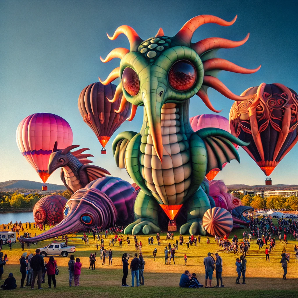 A mesmerizing art installation by Patricia Piccinini featuring giant hot-air balloon sculptures shaped like mythical creatures, touring across Australia.