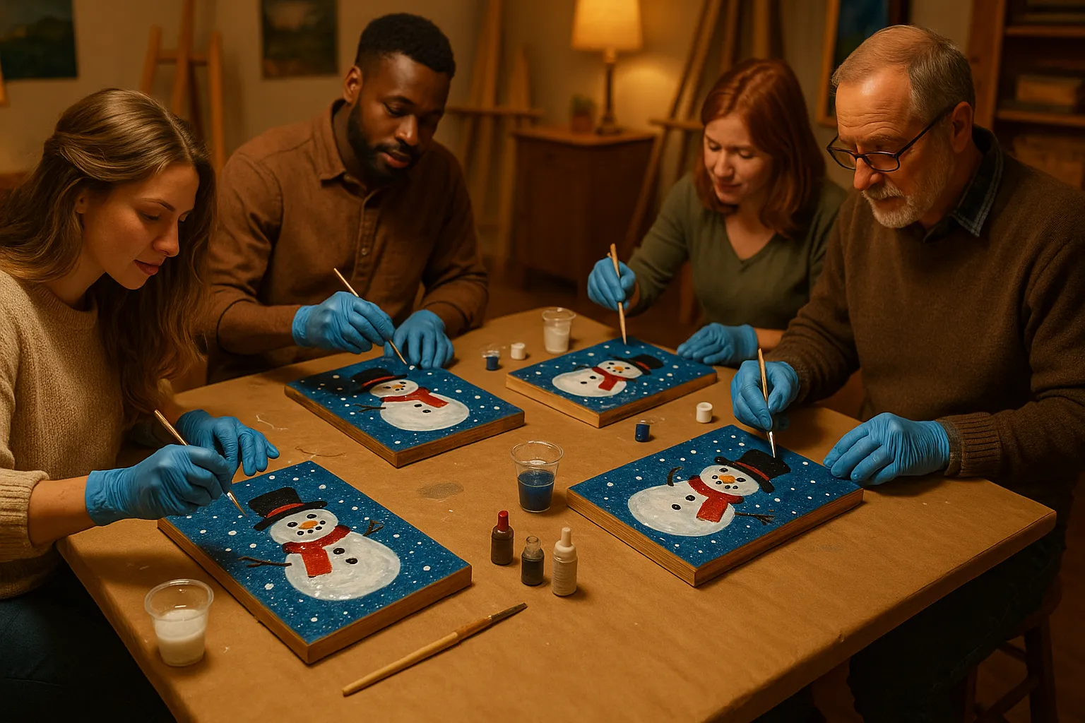 A hands-on winter art class in Windsor where teens and adults create charming snowmen epoxy resin designs on wooden boards.