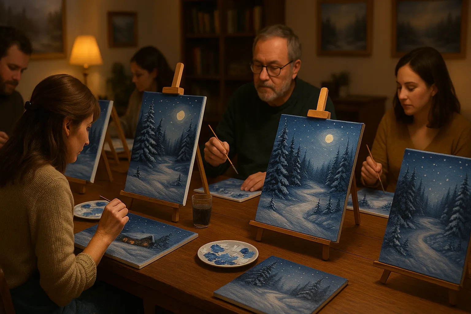 A relaxing acrylic painting workshop in Windsor where adults and teens create peaceful snowy winter landscapes on canvas.