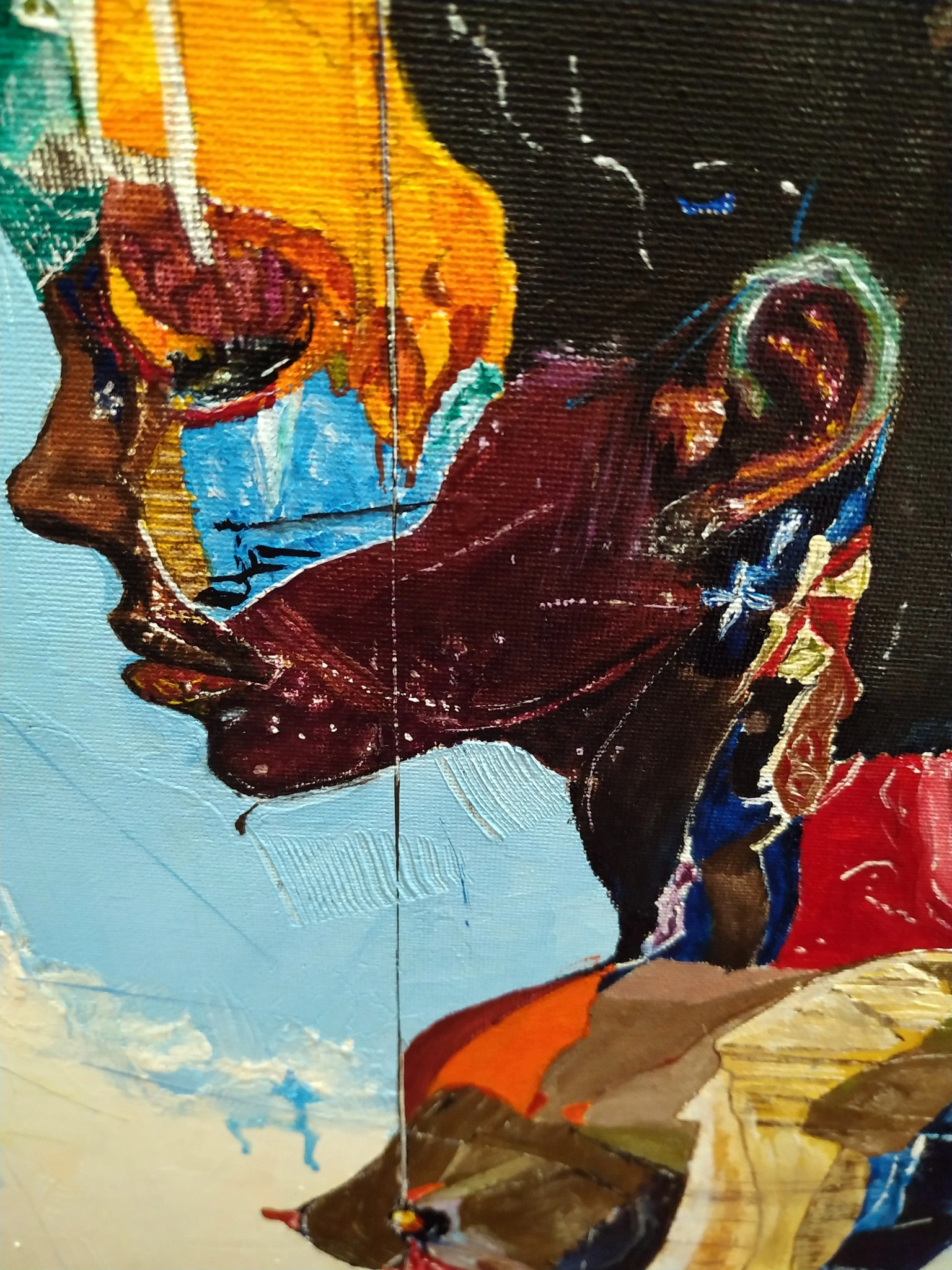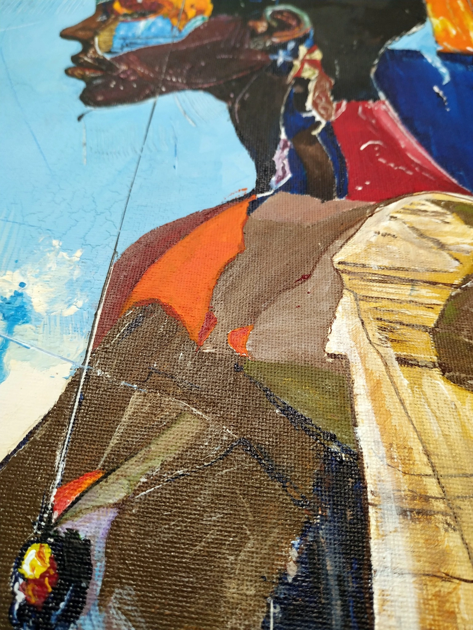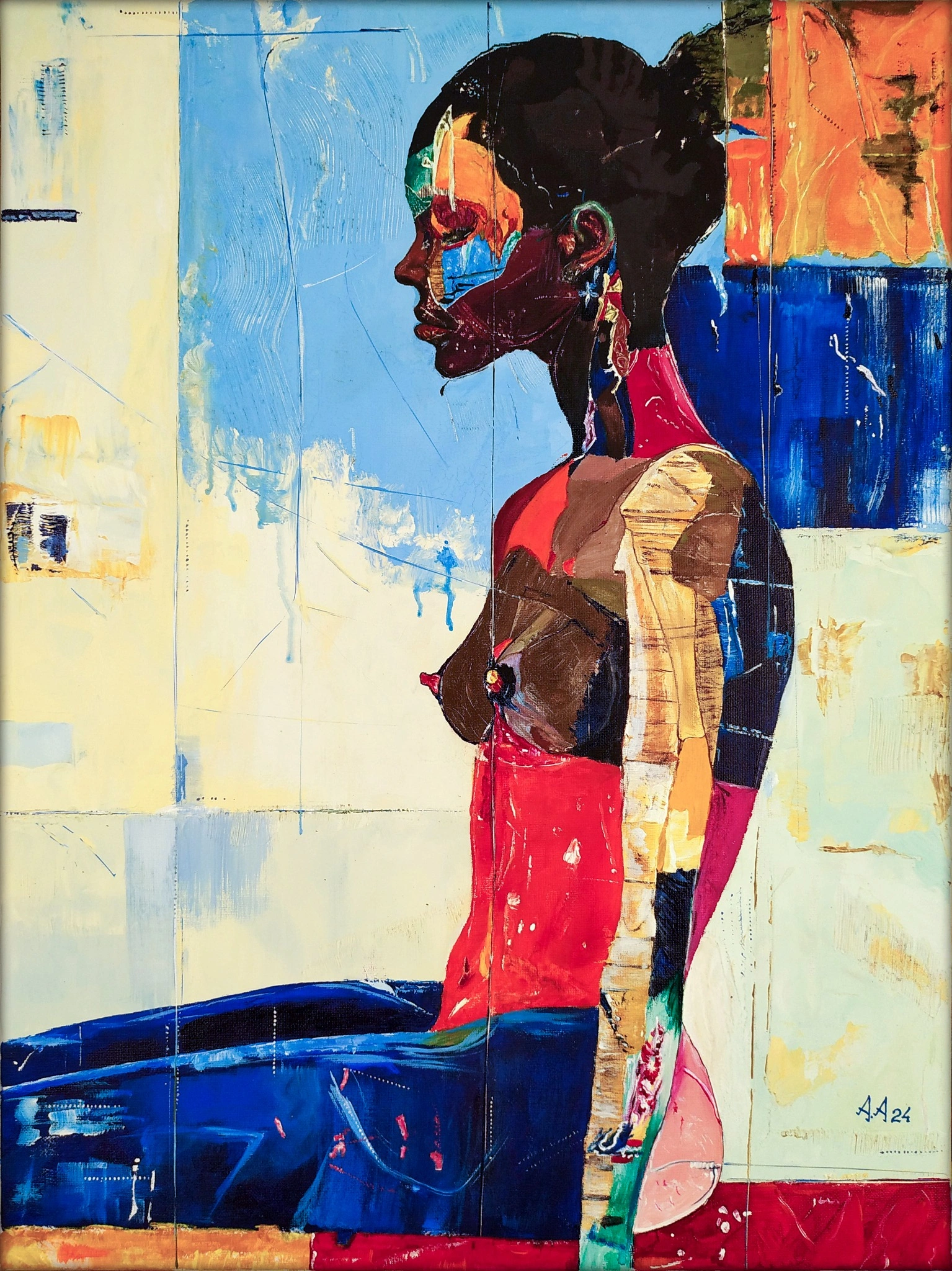 120 Bars of Pause by Alexander Aksyonov captures the quiet beauty of stillness in motion, blending expressive figurative portraiture with vibrant abstraction. Painted in acrylic on canvas, the woman’s poised profile radiates focus and anticipation, her body wrapped in bold strokes of blue, red, and gold. The composition echoes a dancer between beats—pausing not in absence but in presence. A graceful, intimate piece, it enhances calm spaces like a bedroom, lounge, or study with reflective elegance.