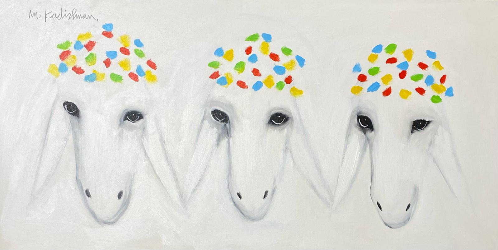 3 Sheeps by Menashe Kadishman showcases three white sheep adorned with colorful crowns against a minimalist white background. The playful yet serene composition features Kadishman's iconic use of vibrant colors and expressive simplicity.