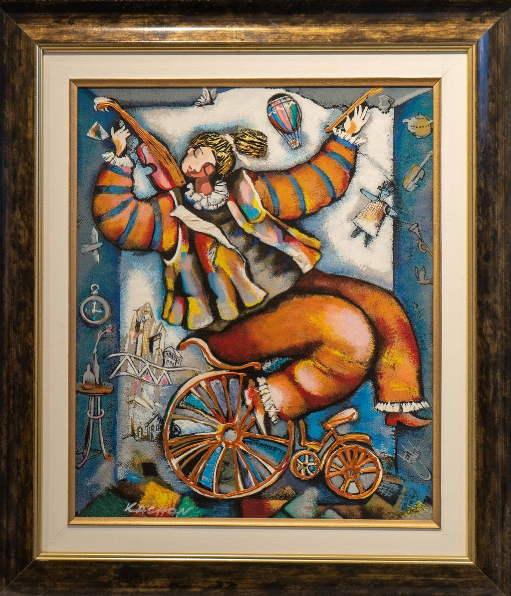 This figurative and naïve art piece captures the essence of playfulness and creativity, featuring a joyful musician floating through a surreal world. The bold use of blue, orange, and yellow enhances the dynamic energy of the composition, while Kachan’s signature style injects warmth and movement into the painting.