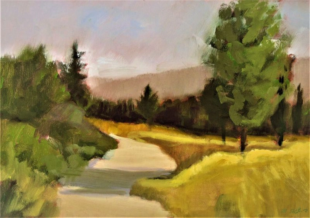 A New Way by Dalia Segev captures a serene and inviting scene of a winding pathway cutting through lush greenery and soft, sunlit fields.