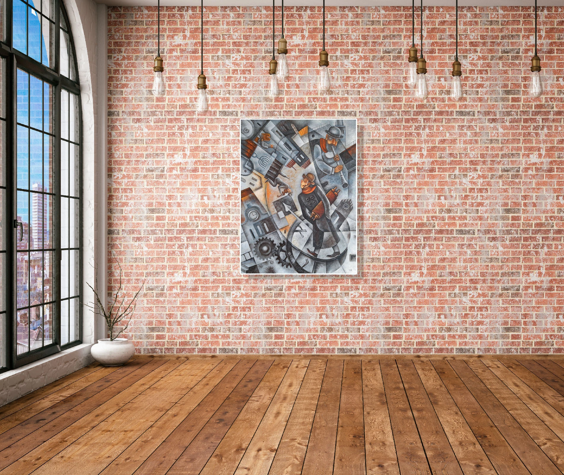 The cubist style of this oil on canvas piece reflects a fragmented, multi-dimensional cityscape where figures blend seamlessly into the background of gears, clocks, and architectural forms. The use of cool grays and fiery orange hues creates a dramatic contrast, highlighting the surreal elements of the painting. At the center, an enigmatic figure, the "stranger," stands out with peculiar attire and accessories, suggesting a narrative of wandering or observation. The surrounding characters appear to be engaged in various activities, adding layers of meaning and intrigue to the composition. The cubist technique emphasizes geometric shapes and angular forms, offering multiple perspectives in a single frame. This style choice not only accentuates the complexity of urban environments but also reflects the chaotic, mechanical aspects of city life. Ideal for modern spaces like an office or study, this artwork brings an element of thought-provoking visual storytelling, inviting viewers to interpret its layered imagery. "A Strange Stranger" is a captivating addition to any collection, offering a blend of classic cubist abstraction with a unique narrative twist.