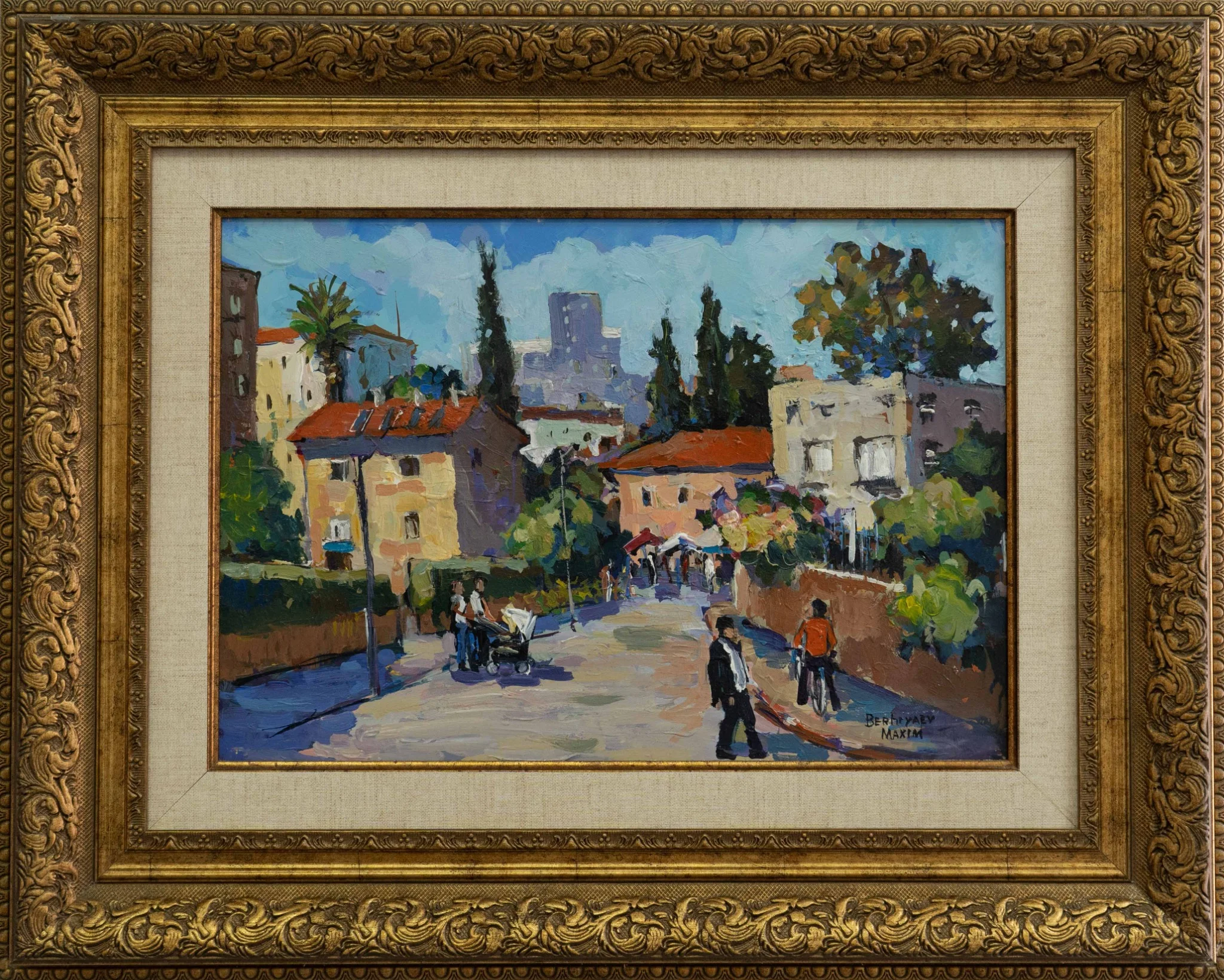 The painting conveys a tranquil yet vibrant moment in an urban residential setting, where people are seen walking, chatting, and enjoying the fresh air. Berhiyaev’s mastery of color and brushwork breathes life into the scene, evoking warmth and nostalgia.