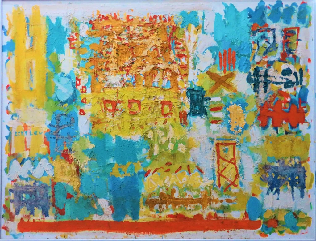 The painting's dynamic use of vibrant yellows, blues, and oranges, alongside playful textures, creates a lively and whimsical atmosphere. Its bold design and joyful energy make it an excellent centerpiece for modern spaces, from large living rooms to gallery walls, showcasing Eti Lev's creative prowess.
