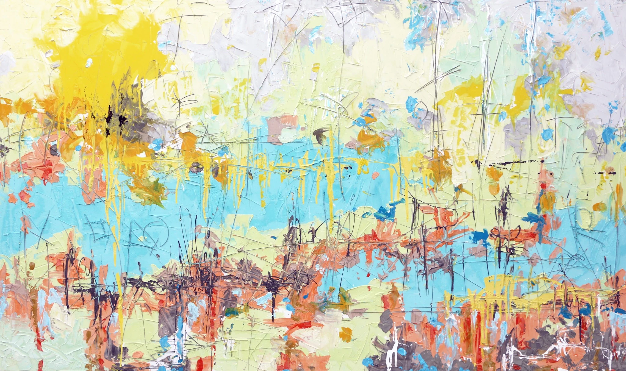 Created with pigmented concrete and pencils on canvas, this abstract masterpiece bursts with vibrant colors and dynamic textures. Bright yellows and soft blues dominate the composition, evoking the early light of sunrise, while earthy oranges, greens, and reds weave together to create a landscape that feels both uplifting and serene. The expressive use of concrete and pencil brings a tactile depth to the work, adding to its layered complexity. The interplay of bold strokes and subtle details conveys the transition from darkness to light, making "AFTER THE DARK" a profound reflection on resilience and renewal. This painting offers a vibrant focal point for spaces that seek to inspire creativity and optimism. Dubi Ronen, an innovative Israeli artist, merges abstract artistry with design expertise, creating works that resonate emotionally and visually. "AFTER THE DARK" is an excellent choice for modern living rooms, contemporary galleries, hotel lounges, or creative workspaces, infusing them with energy and hope.