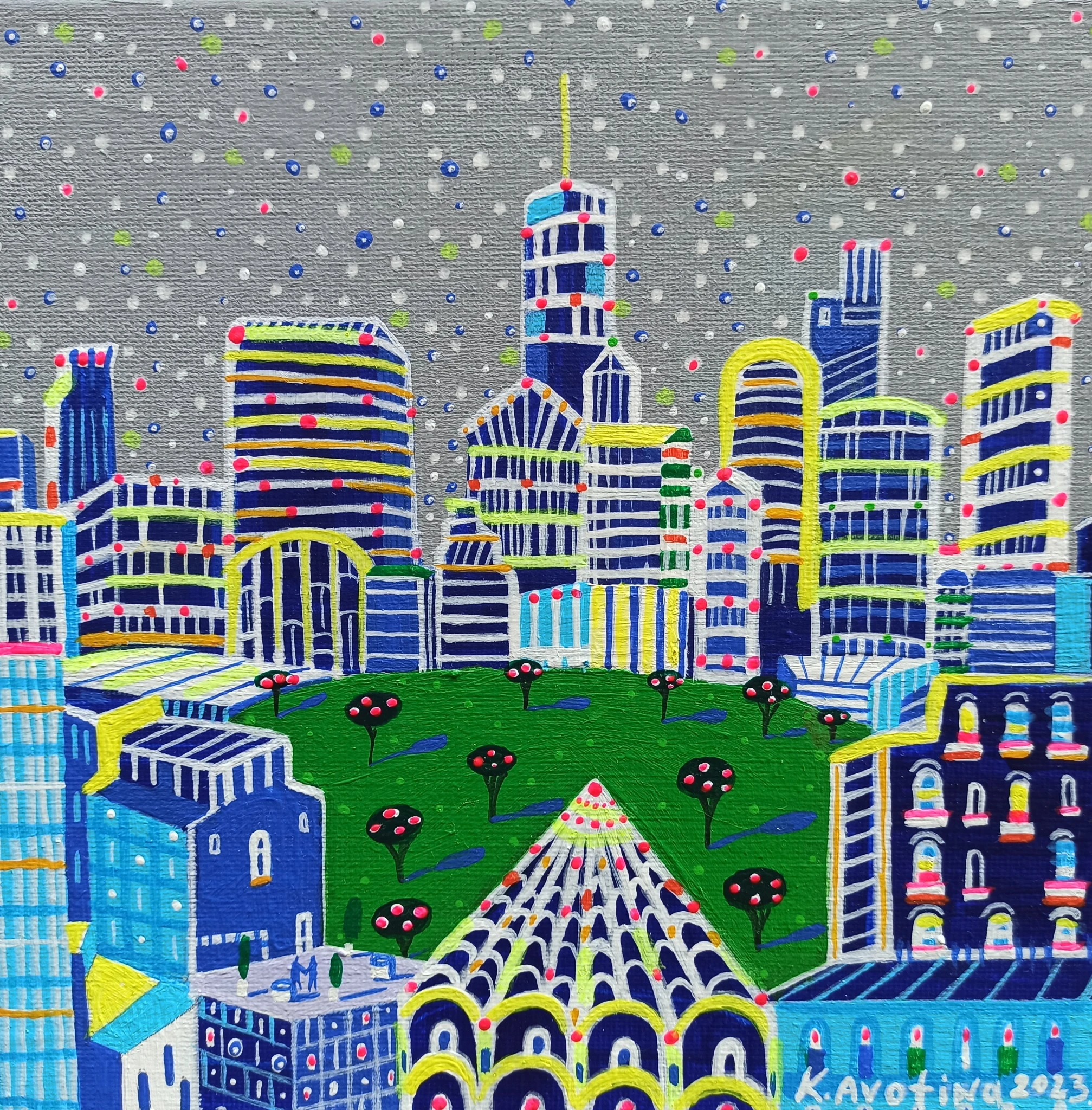 “After The Rain” by Katrina Avotina radiates joy and innocence through a vibrant acrylic cityscape. Painted on a small 20×20 cm canvas, the work features stylized buildings encircling a lush green park, where trees bloom like candy under a dotted sky. The artist’s signature use of color and narrative evokes a whimsical atmosphere, turning a rainy day into a playful celebration of light and life. Influenced by Hundertwasser and Matisse, Avotina delivers a heartfelt vision of urban beauty infused with hope and wonder. Ideal for kitchens, children’s rooms, or bright hallways, this painting offers an instant uplift.