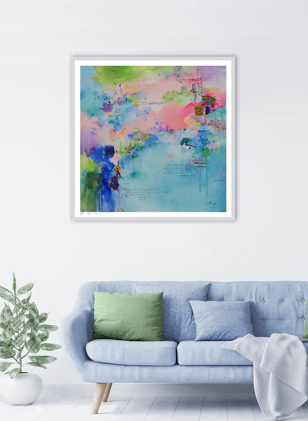 Measuring 60 x 60 cm, this 2024 limited-edition giclée print (on textured fine art paper, 300g/m²) blends the vibrancy of Parisian landmarks with serene natural motifs, inviting viewers to reflect on moments of simple beauty. Each print is signed and numbered by the artist, ensuring its uniqueness and collectible value. The composition radiates with pastel hues and delicate splashes of color, enhanced by collaged elements such as the Eiffel Tower and handwritten Biblical text. These symbols connect East and West, evoking Xiaoyang’s intention to inspire peace and harmony. Her artistic philosophy is evident throughout, as she magnifies life's essential joys through a poetic interplay of texture, language, and light. This artwork is ideal for living spaces or gallery walls, infusing any room with an optimistic and reflective atmosphere. A true testament to Galas’ mastery in blending culture and emotion, "Amazing Day in Paris" brings warmth and inspiration into everyday life.