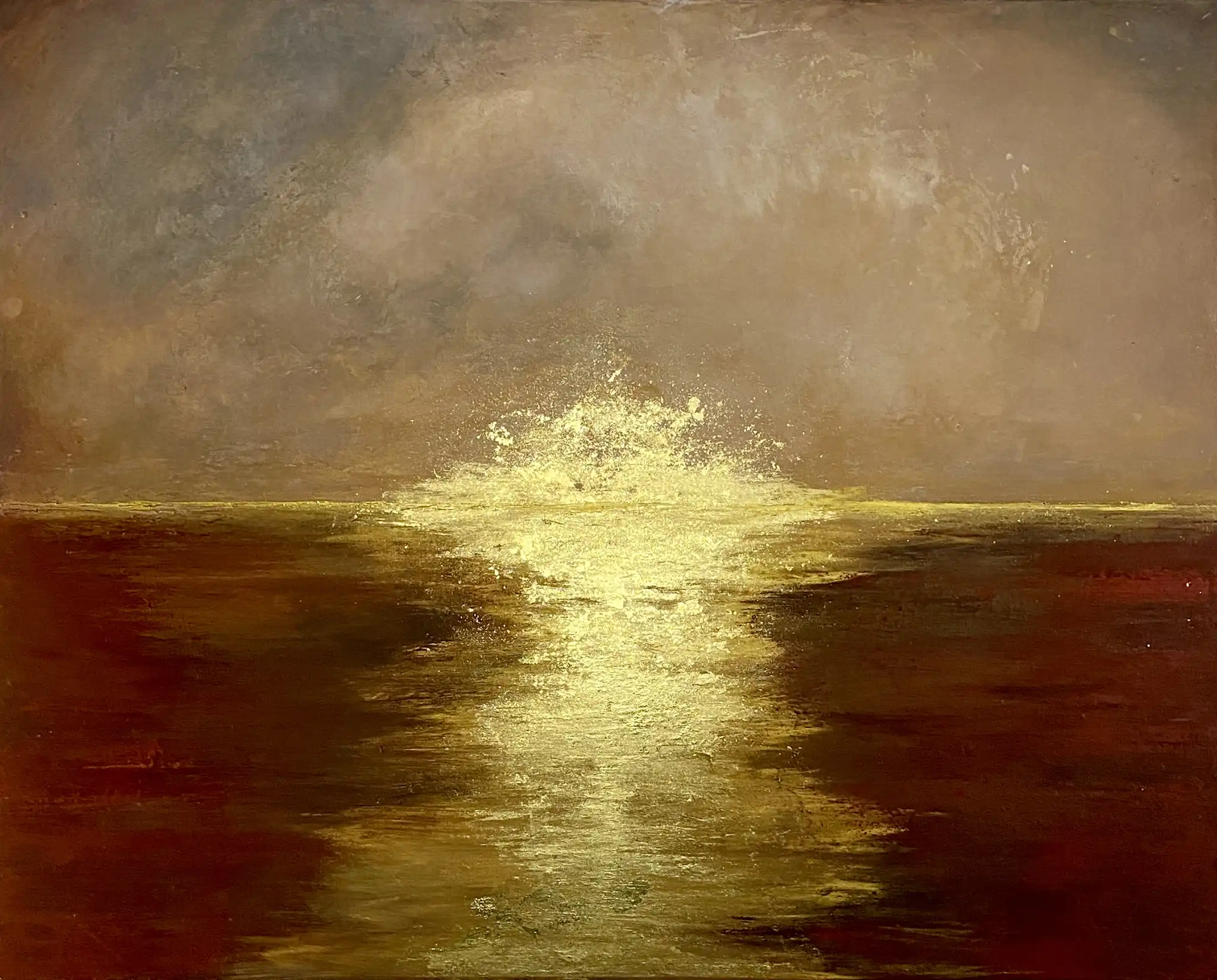 Dravet, a renowned artist known for her abstract landscapes, employs rich gold leaf against warm acrylic hues, creating a textured reflection that invites viewers to bask in the beauty of nature’s quiet moments. This piece blends elements of minimalism with a hint of impressionistic influence, a testament to Dravet’s mastery in conveying depth and atmosphere. The soothing golden hues and gentle gradient shifts make it an ideal choice for spaces designed to cultivate tranquility and introspection, such as living rooms, bedrooms, or meditation areas. Dravet’s work not only captures a visual but evokes an emotion, making "An Extraordinary Evening" a truly timeless addition to any art collection.