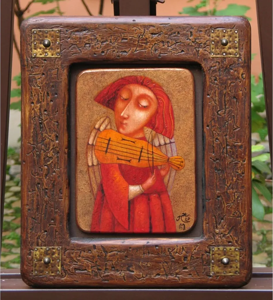 Angel Playing Music evokes serenity. This painting by Pavel Nikolayev, created using unique oil-on-wood techniques, portrays a serene angel playing music.