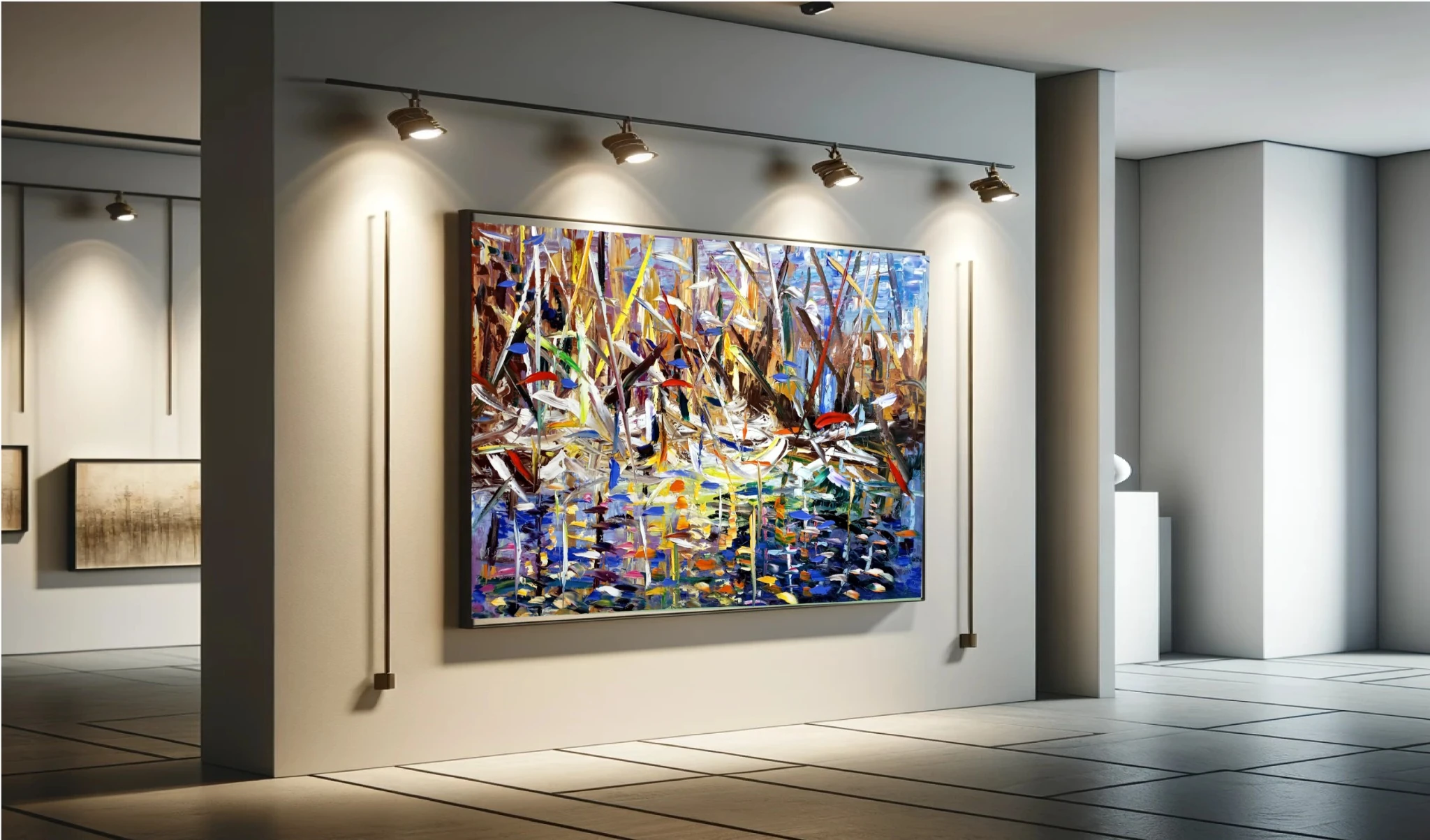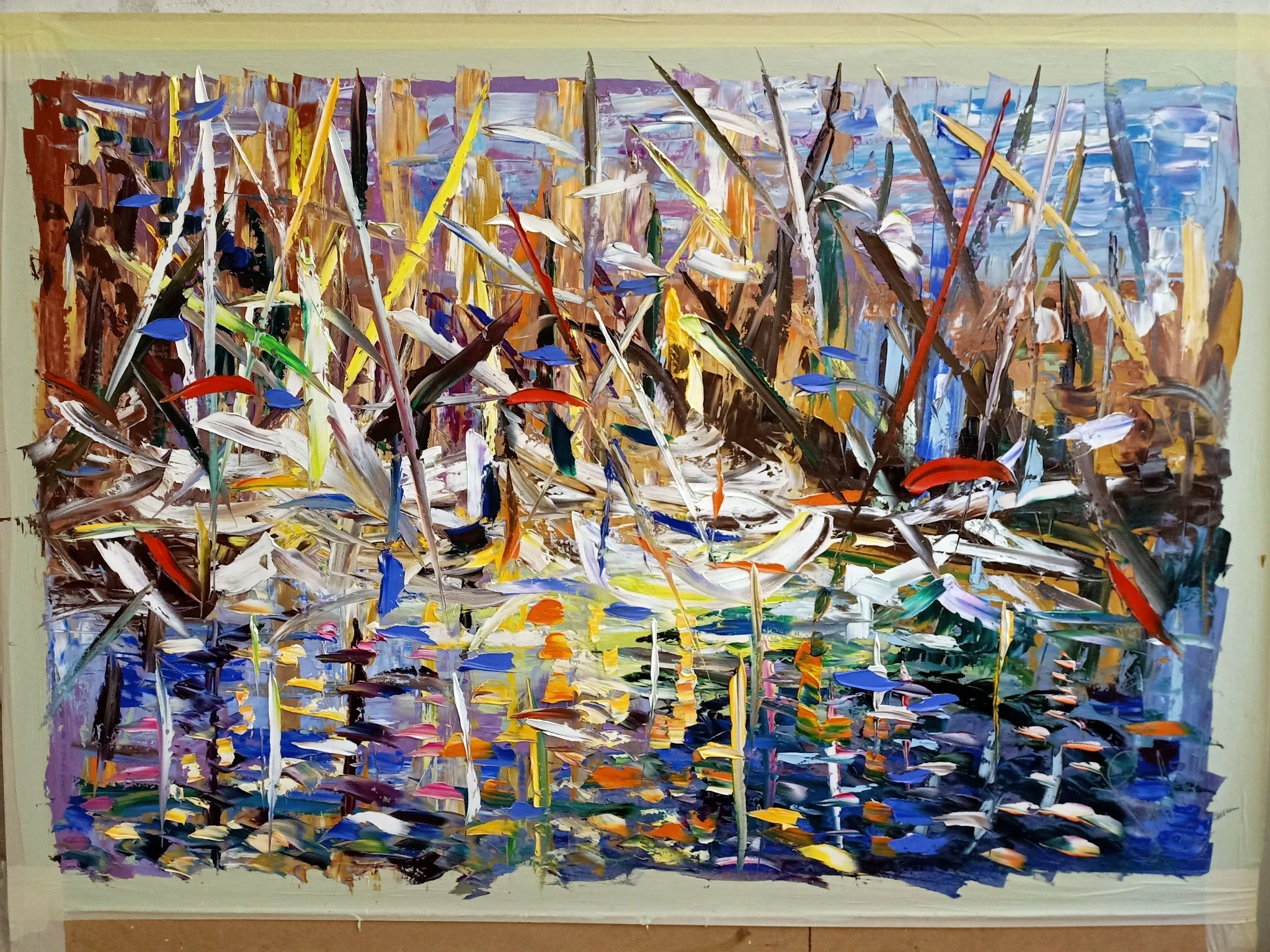 Using his signature palette knife technique, Puliafico has created a dynamic scene where water reflections and vegetation come alive with a spectrum of colors. Shades of yellow, blue, and earthy tones interweave, forming a textured, impressionistic composition that evokes harmony and energy.