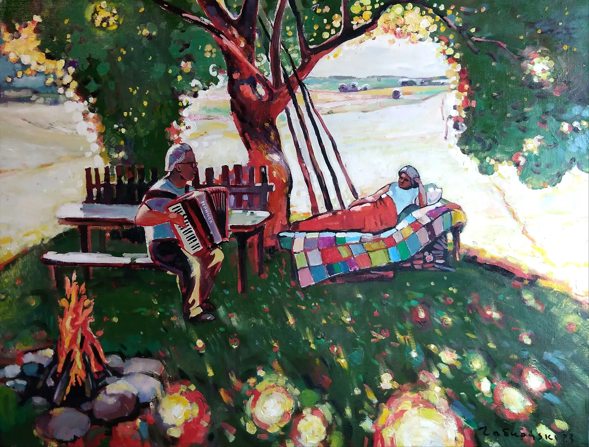 Labkouski's impressionistic style, characterized by loose brushwork and a keen sensitivity to light and color, breathes life into the scene. The flickering flames of a small fire, the lush greenery, and the gentle play of light and shadow all contribute to the painting’s inviting, nostalgic atmosphere. It is as if time slows down, allowing the viewer to savor the harmony and stillness of the moment. This artwork is ideal for spaces like living rooms, offices, galleries, or homes with a rustic aesthetic, where its warmth and charm can be fully appreciated. "Anthem to the Summer" serves as a beautiful reminder of the peaceful, unhurried pace of life in the countryside, making it a perfect piece for those who cherish the idyllic simplicity of nature.
