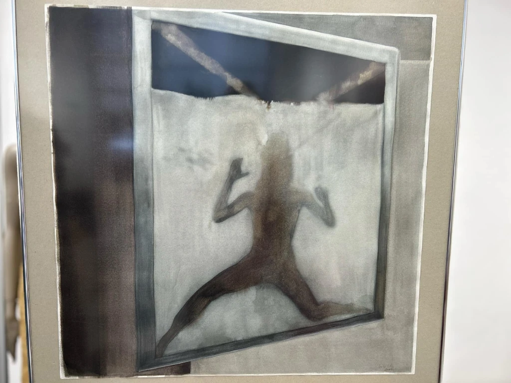 Using cold monochrome and grey tones, Csurka evokes an intense claustrophobic sensation. The form is figurative yet ghostlike, a silhouette of tension and psychological strain. The abstract presentation doesn't distance the viewer; rather, it draws them inward, into a confrontation with the figure’s vulnerability and the surreal boundary of the glass.