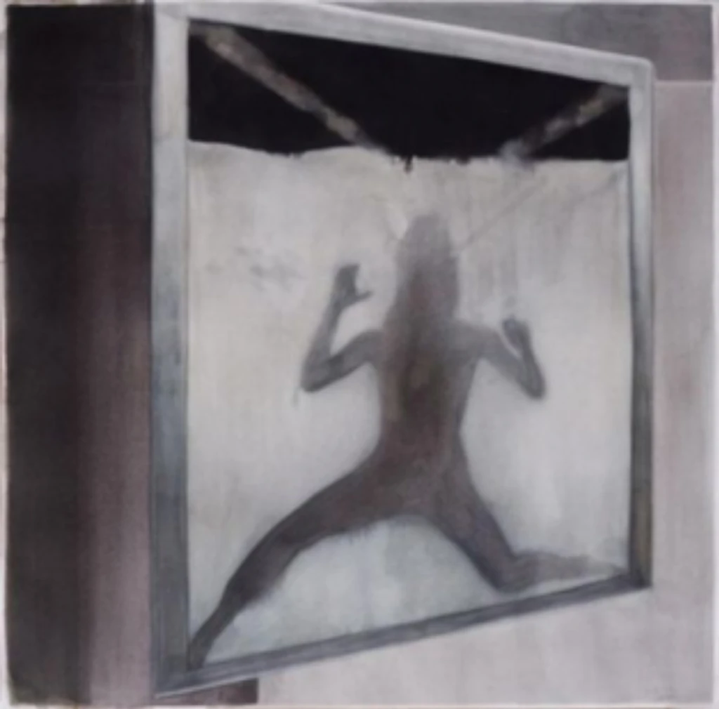 the piece captures a shadowed figure pressing outward within a tilted, translucent tank. The posture is wide, almost defiant, yet also frantic—caught between flight and containment.