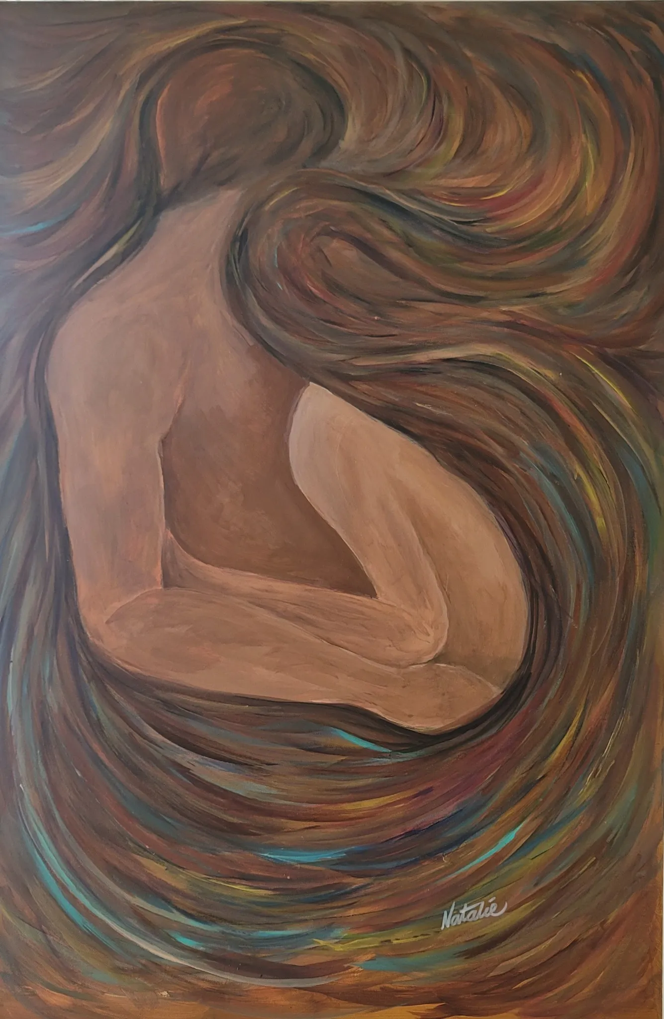 In Natalie Benedik Isikli’s Artwork 3, a faceless nude form is enveloped in soft, flowing brushwork and earthy hues.