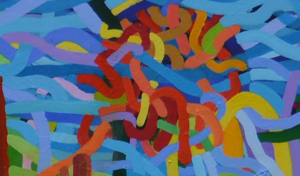 Richard Heley's signature style shines through, blending naïve and abstract elements with a joyous explosion of color. The intricate play of shapes and hues creates a harmonious yet whimsical atmosphere, inviting viewers to immerse themselves in its captivating vibrancy. This painting captures the essence of happiness and freedom, making it a perfect centerpiece for a large wall in a reception area, lounge, or hallway.