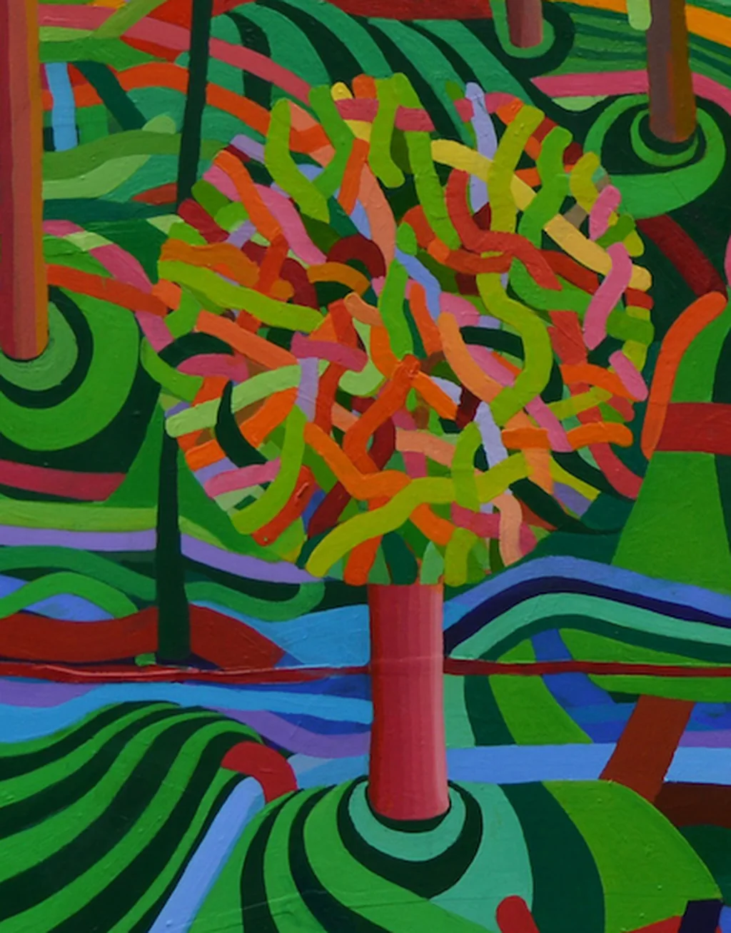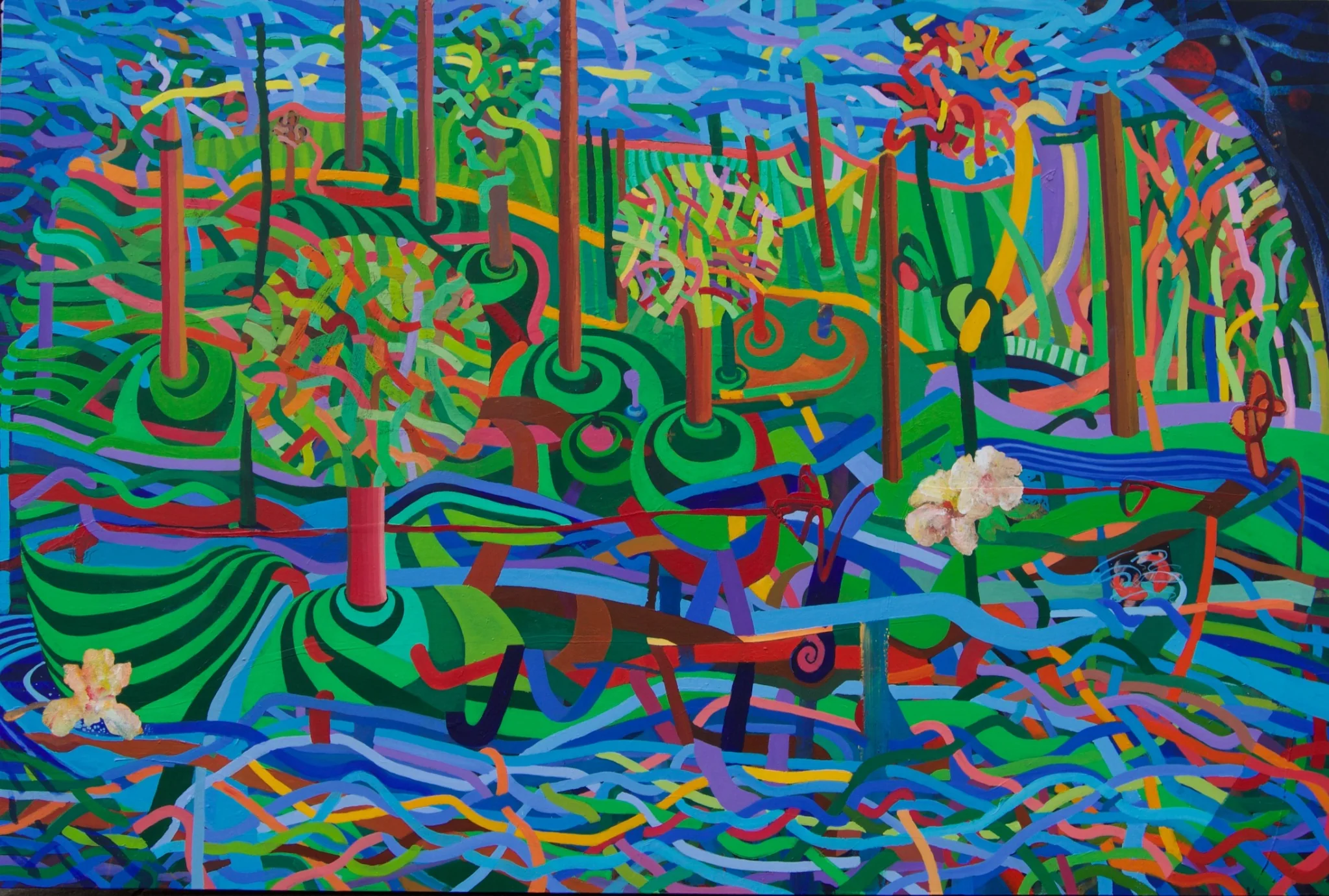 Spanning an impressive 122 x 183 cm, this vibrant painting is a celebration of abstract forms intertwined with nature. The composition features dynamic, geometric patterns of lush greens, earthy reds, and vivid blues, layered with floral accents and ribbon-like lines that evoke an otherworldly garden.