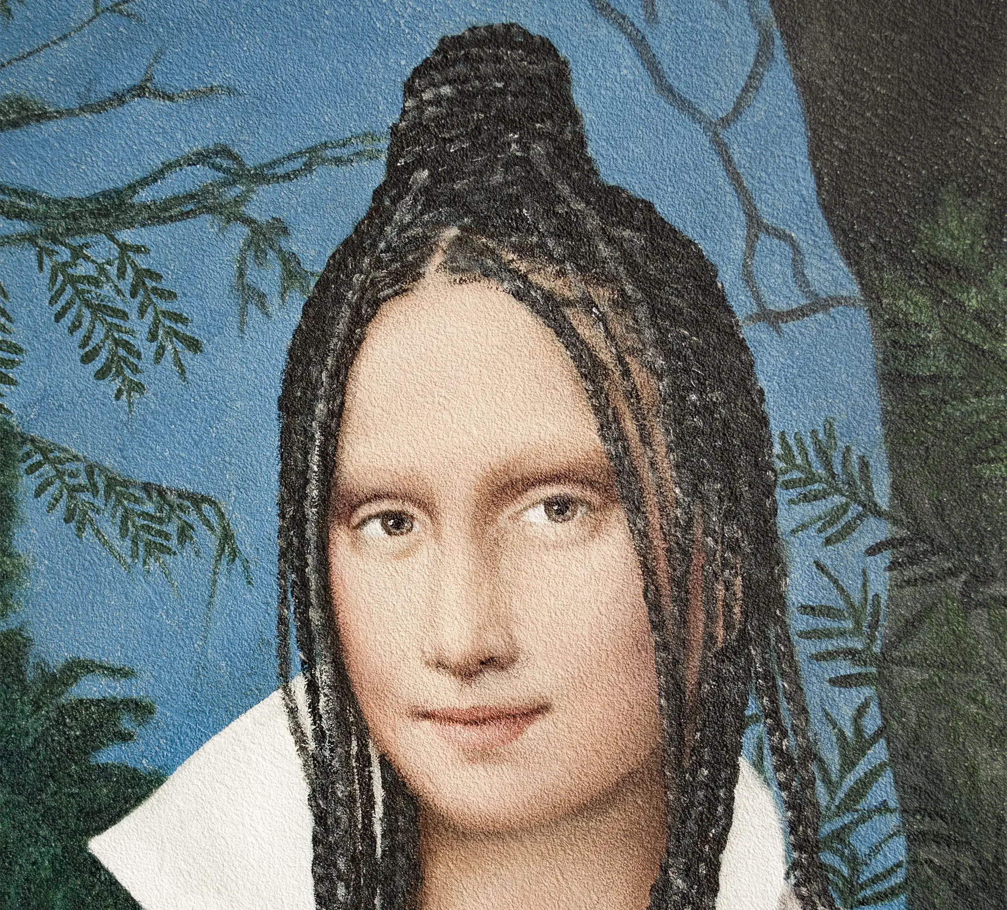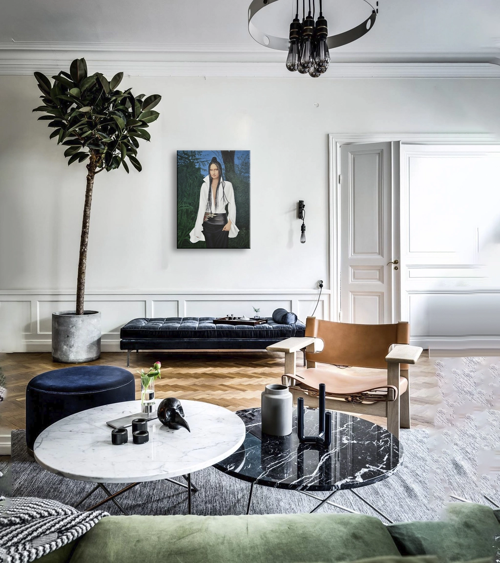 This 80x60 cm hyperrealistic painting blends portraiture with a serene natural backdrop. The subject dressed in a bright white blouse and a rich black skirt with intricate details stands against a deep green and blue foliage filled background evoking the stillness and allure of the night.
