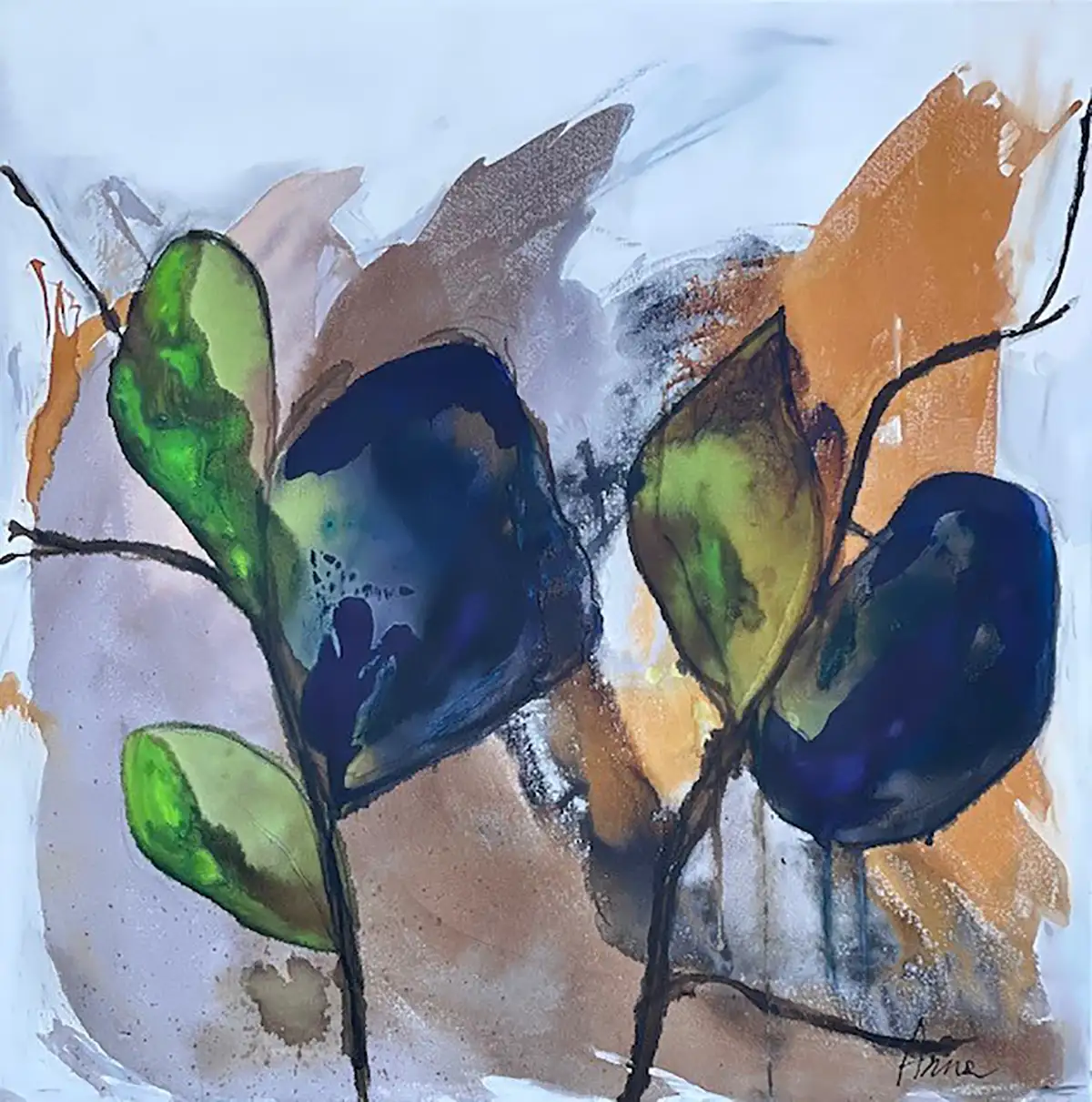 The "Autumn" painting by Anna Ayash is a vivid representation of the season's spirit, characterized by its abstract foliage shapes that seem to dance across the canvas. The color palette is a celebration of autumn's warmth with deep blues, vibrant greens, and earthy browns, invoking a sense of growth amidst decay. The lighting varies across the painting, giving life to the colors and creating a dynamic visual experience. The style is contemporary abstract, where every brushstroke contributes to the overall mood of change and maturity. The emotional impact is one of reflection and transition, mirroring the shifting seasons. This piece would resonate in a space dedicated to contemplation and natural serenity, making it suitable for locations like a living room or study, where it can be given thoughtful appreciation.