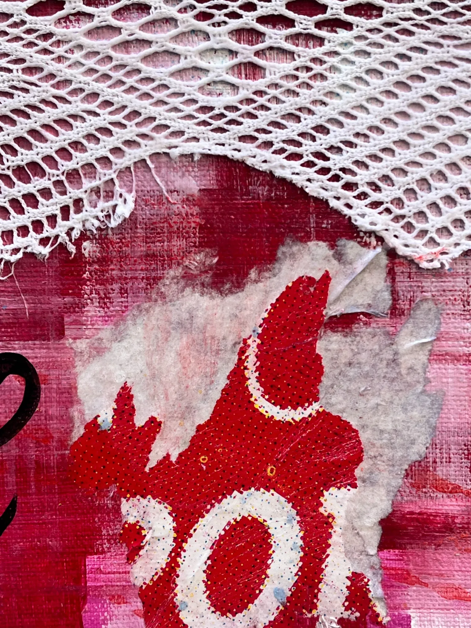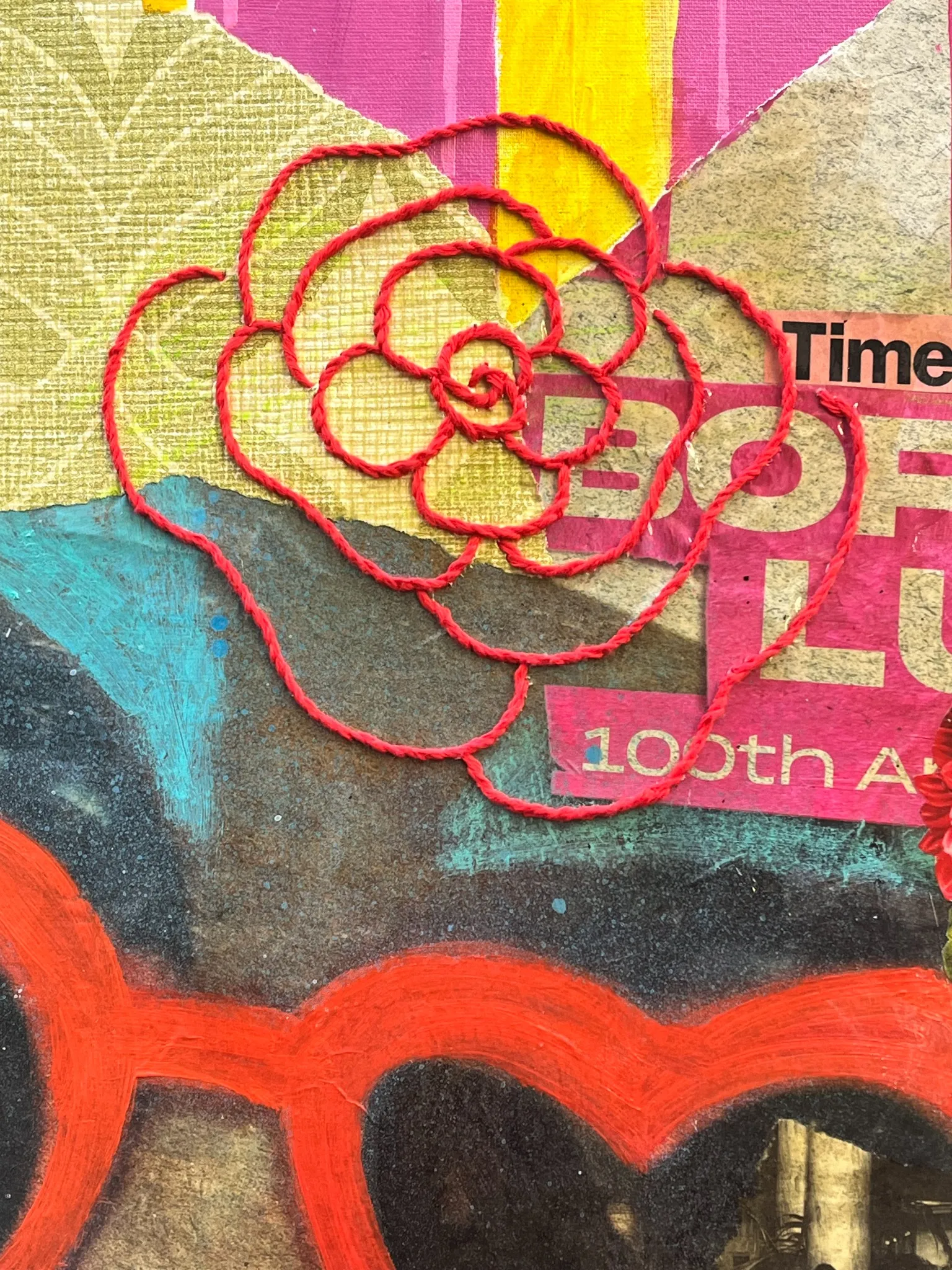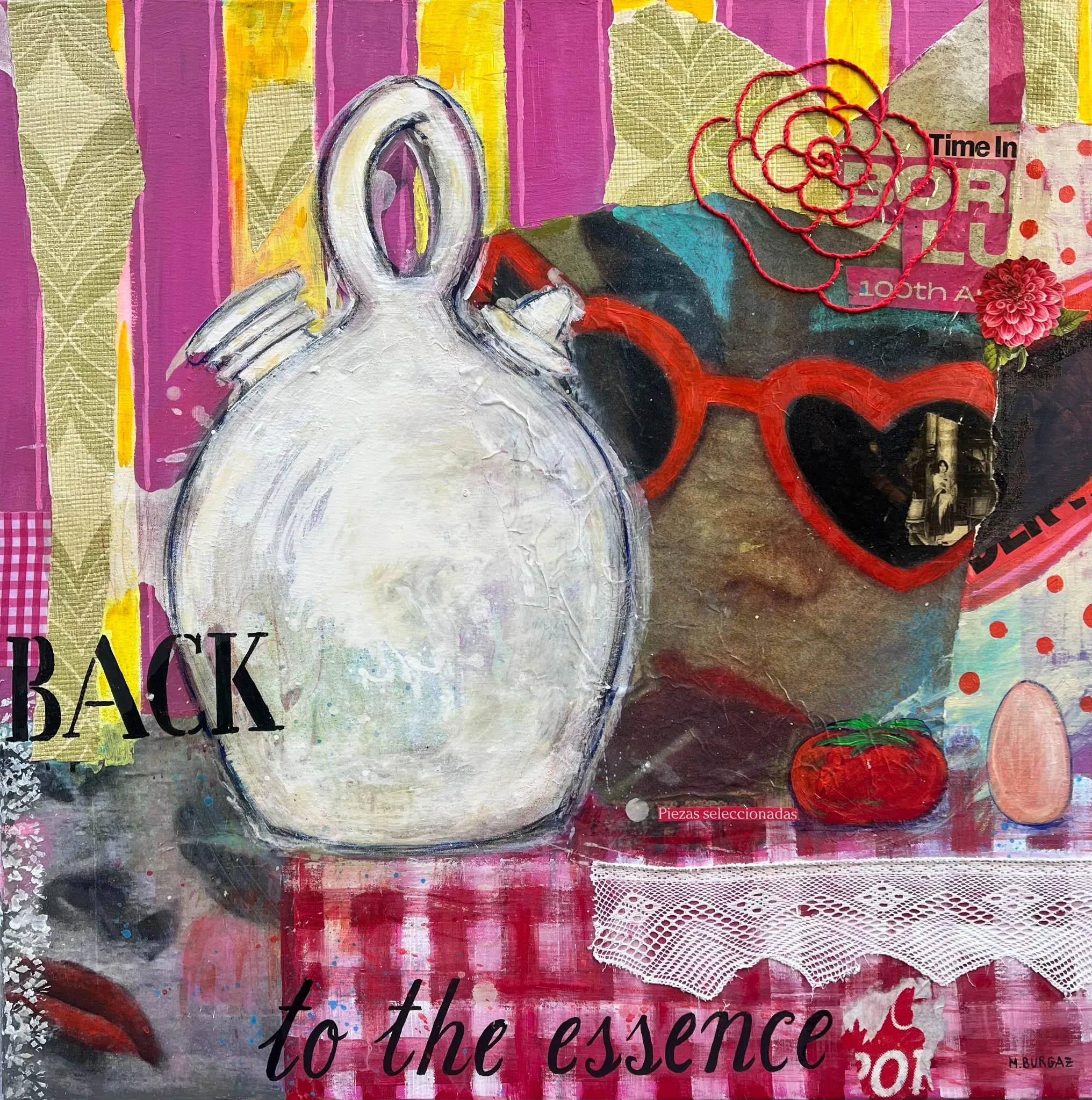 The piece reflects Burgaz's signature style: colorful, nostalgic, and full of joyful detail. With bold layering of fabric, paint, and collage, the painting captures the essence of domestic life while inviting reflection and fun. Themes like food, typography, and portrait subtly emerge, bringing personality and warmth to the work.