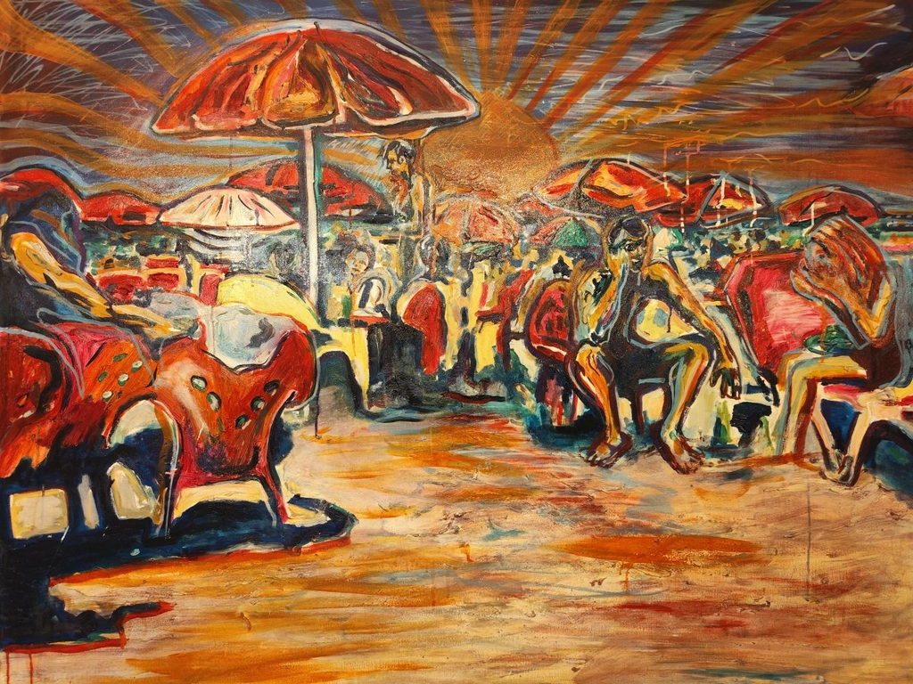 The artwork bursts with energy, portraying a lively beach scene where figures lounge under red umbrellas while warm sunlight floods the canvas. Calderon’s mastery of vibrant colors—deep reds, glowing yellows, and contrasting blues—creates a dynamic and expressive composition. Ideal for living rooms or gallery spaces, "Beach" radiates joy and the excitement of a sunny day at the shore.