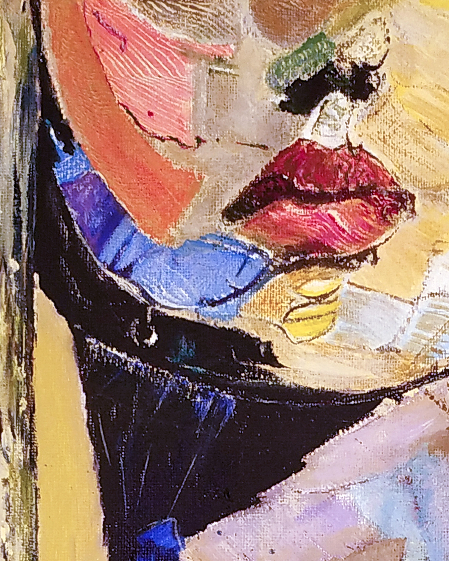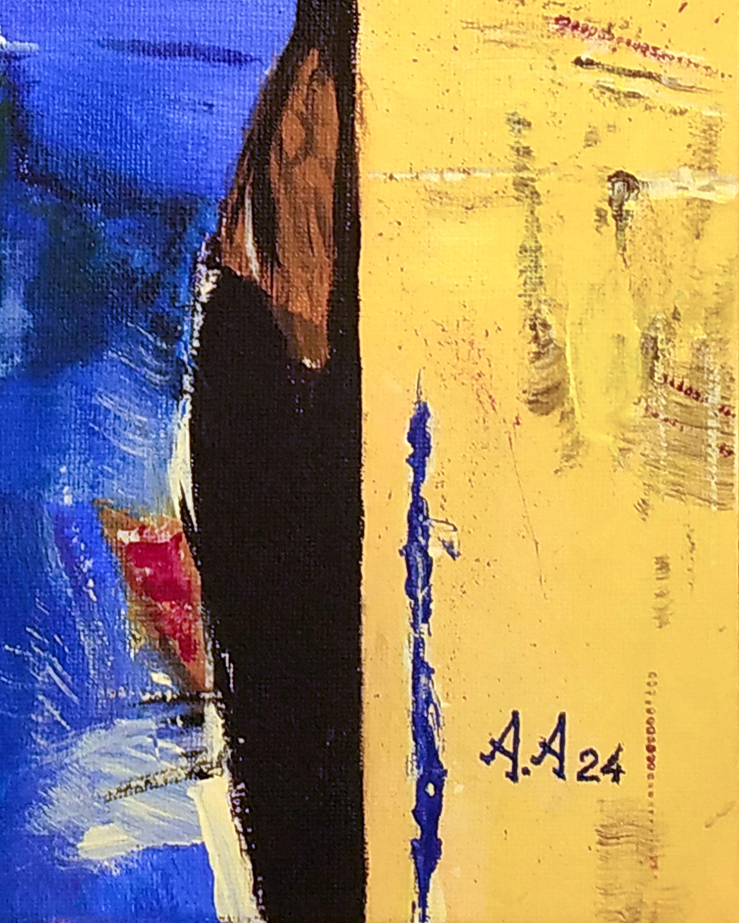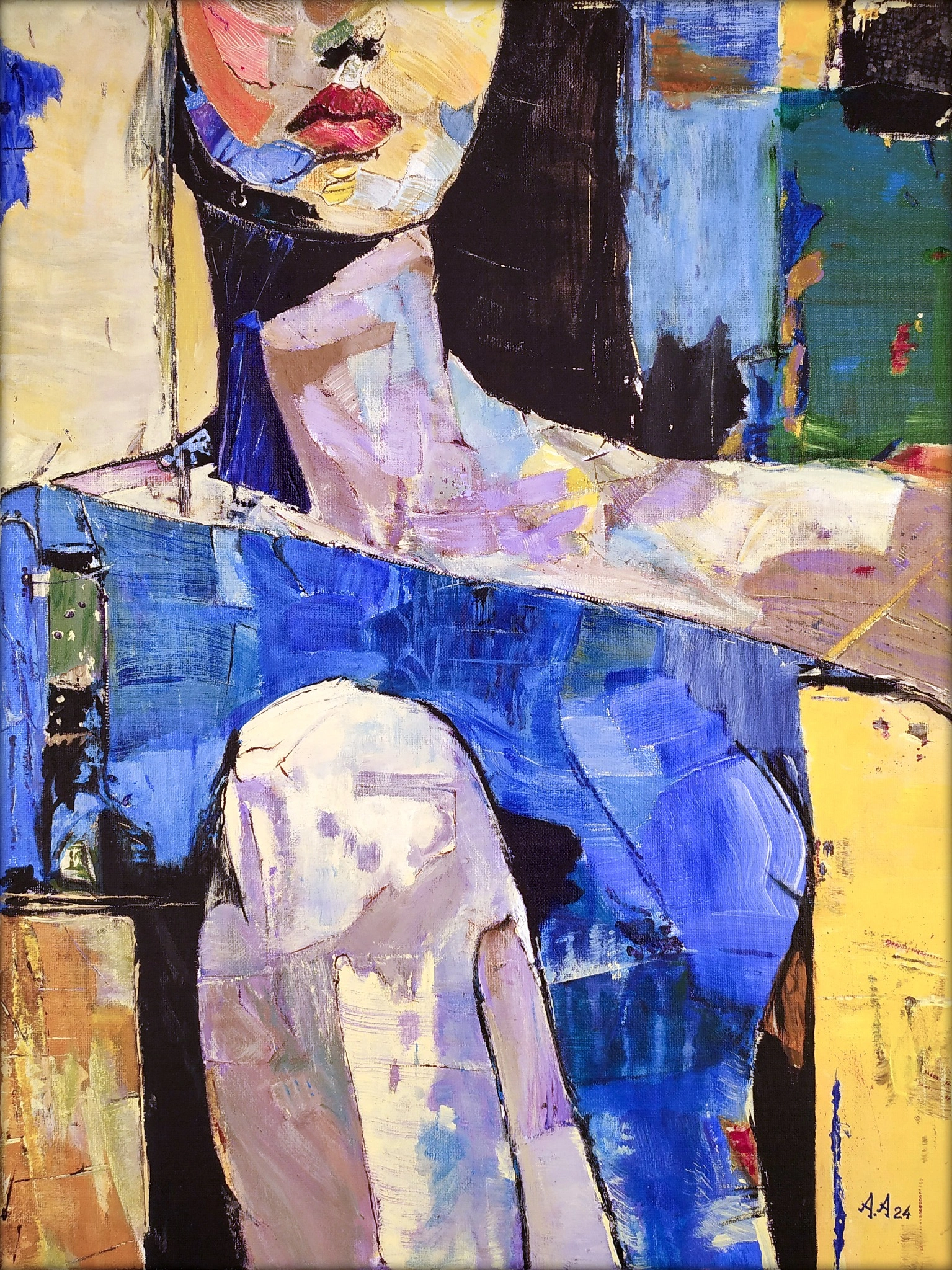 Beyond the Blue distills emotion through fragmented planes of color, with a focus on the curve of a figure cloaked in vibrant indigo. The partial view—lips, shoulder, and knee—creates a mood of quiet solitude, inviting viewers to fill in what lies unseen. Aksyonov’s brushwork feels both deliberate and spontaneous, layering shades of cobalt, lilac, and ochre to amplify emotional contrast. The composition suggests a private moment suspended in time—vulnerable, poised, and utterly magnetic.