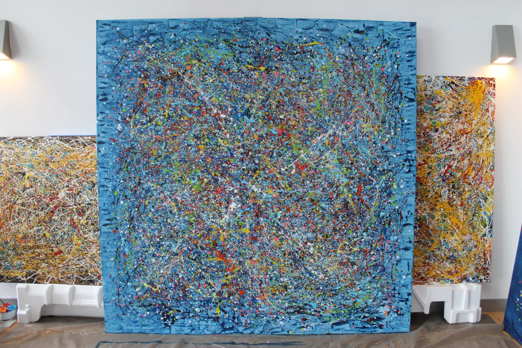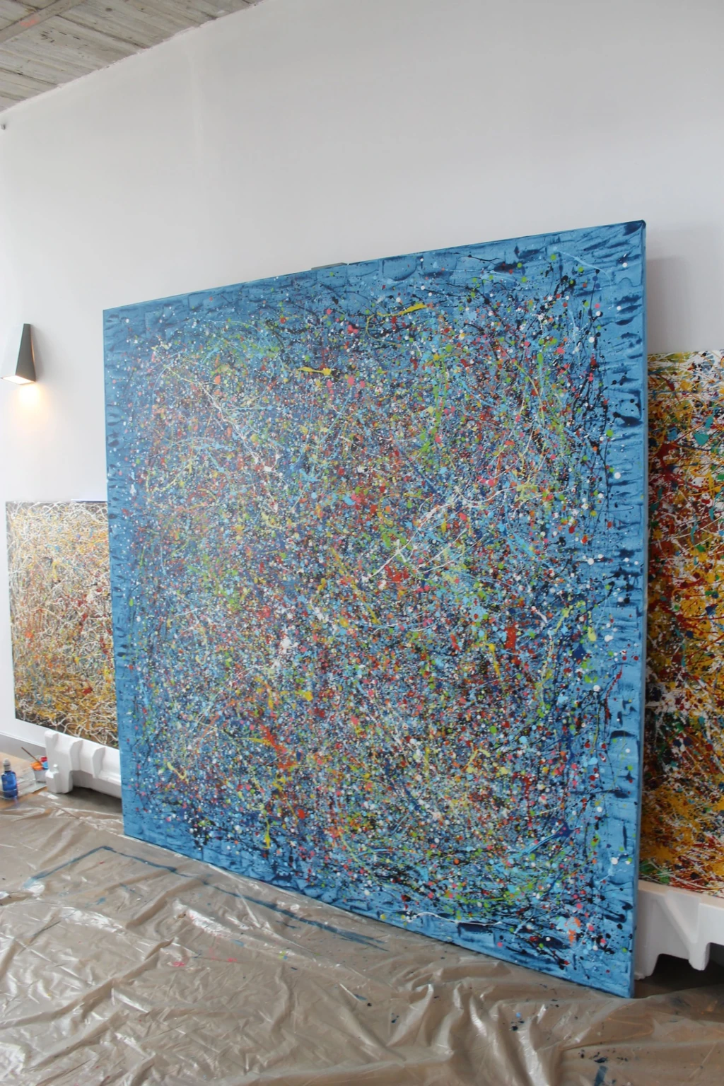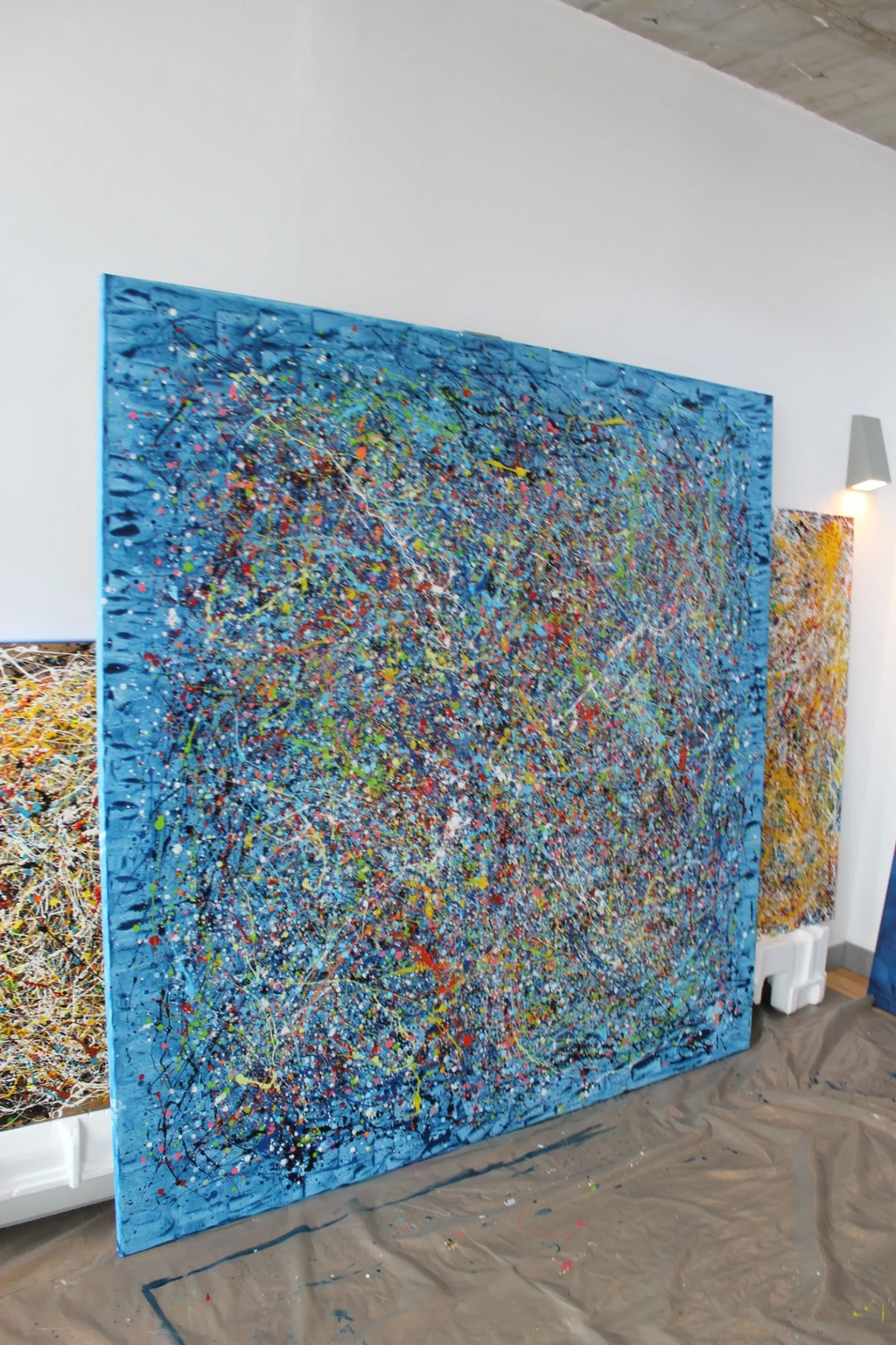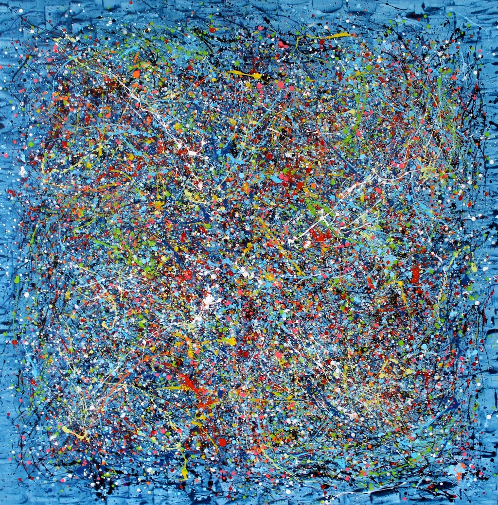 Dominated by shades of blue interspersed with multicolored splashes and intricate white accents, the piece embodies energy, hope, and a bold sense of optimism.