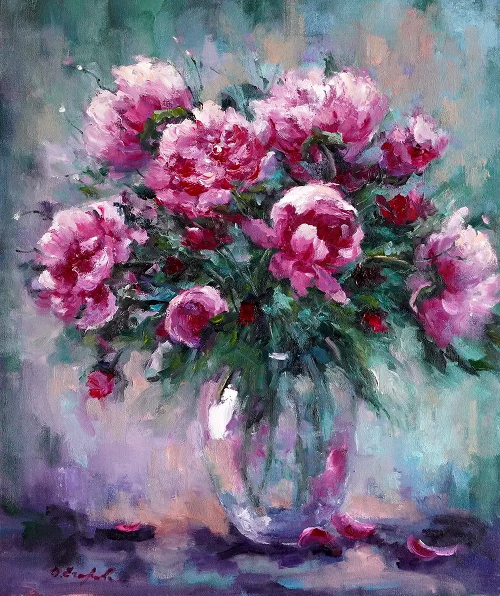Peonies Bouquet: A delicate oil painting depicting lush peonies in full bloom, expressing a tender vitality.