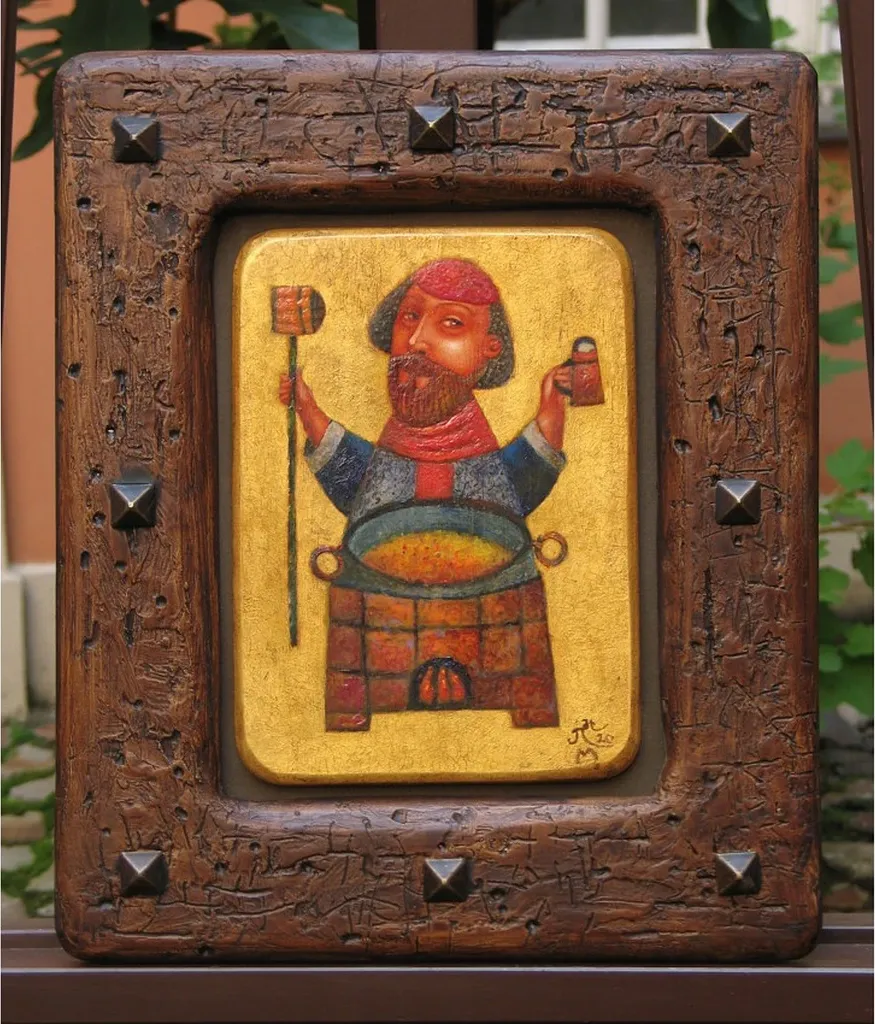Rendered on wood, the artwork depicts a charming brewer, whose cheerful demeanor adds a rustic flair to the painting. The golden background and earthy tones provide a radiant warmth, while the wood's texture enhances the character's whimsical charm. Pavel Nikolayev’s mastery of painting on wood is evident, and this piece serves as a perfect centerpiece for cozy spaces or eclectic interiors. Exhibited internationally, this work is part of the artist's acclaimed collection blending humor and folk-art motifs.