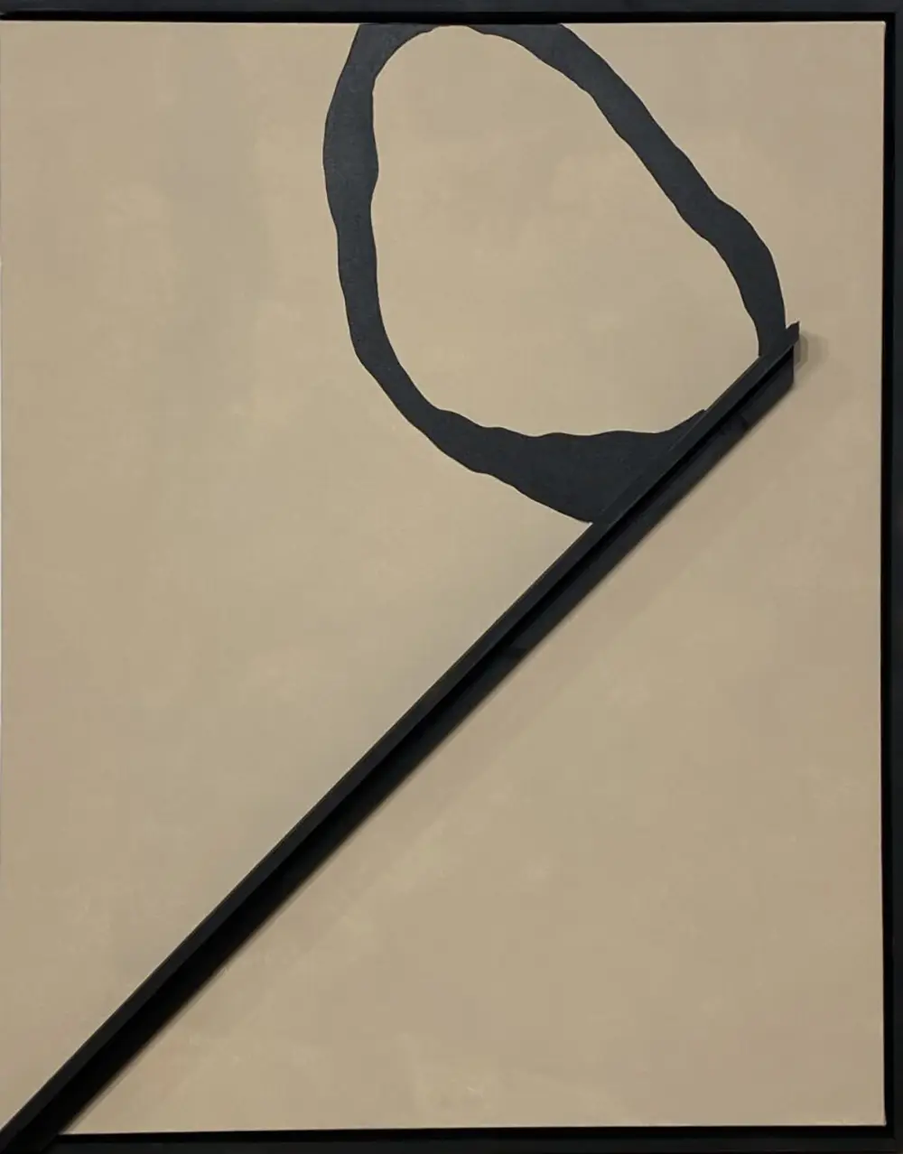 Broken Soul by Link is a minimalist abstract painting featuring a black, irregular circle and a diagonal line against a beige background.