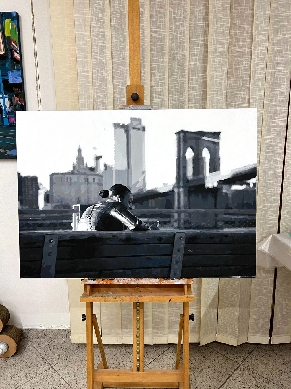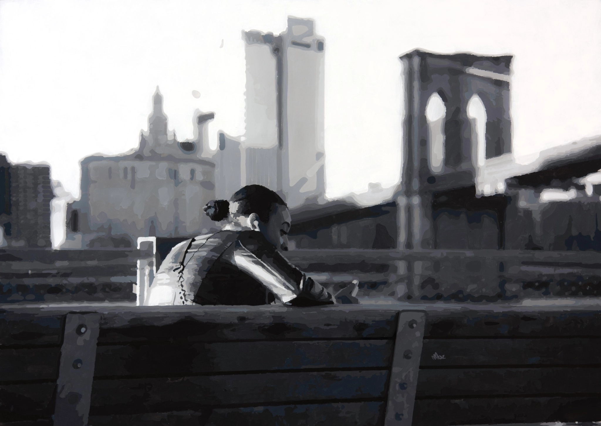 Painted in acrylic on a 100 x 70 cm canvas, this monochrome urban artwork portrays a lone figure seated on a bench, back turned to the viewer, as the iconic Brooklyn Bridge and surrounding architecture fade into a grayscale skyline. Every element—from the figure’s posture to the blurred background—echoes quiet introspection.