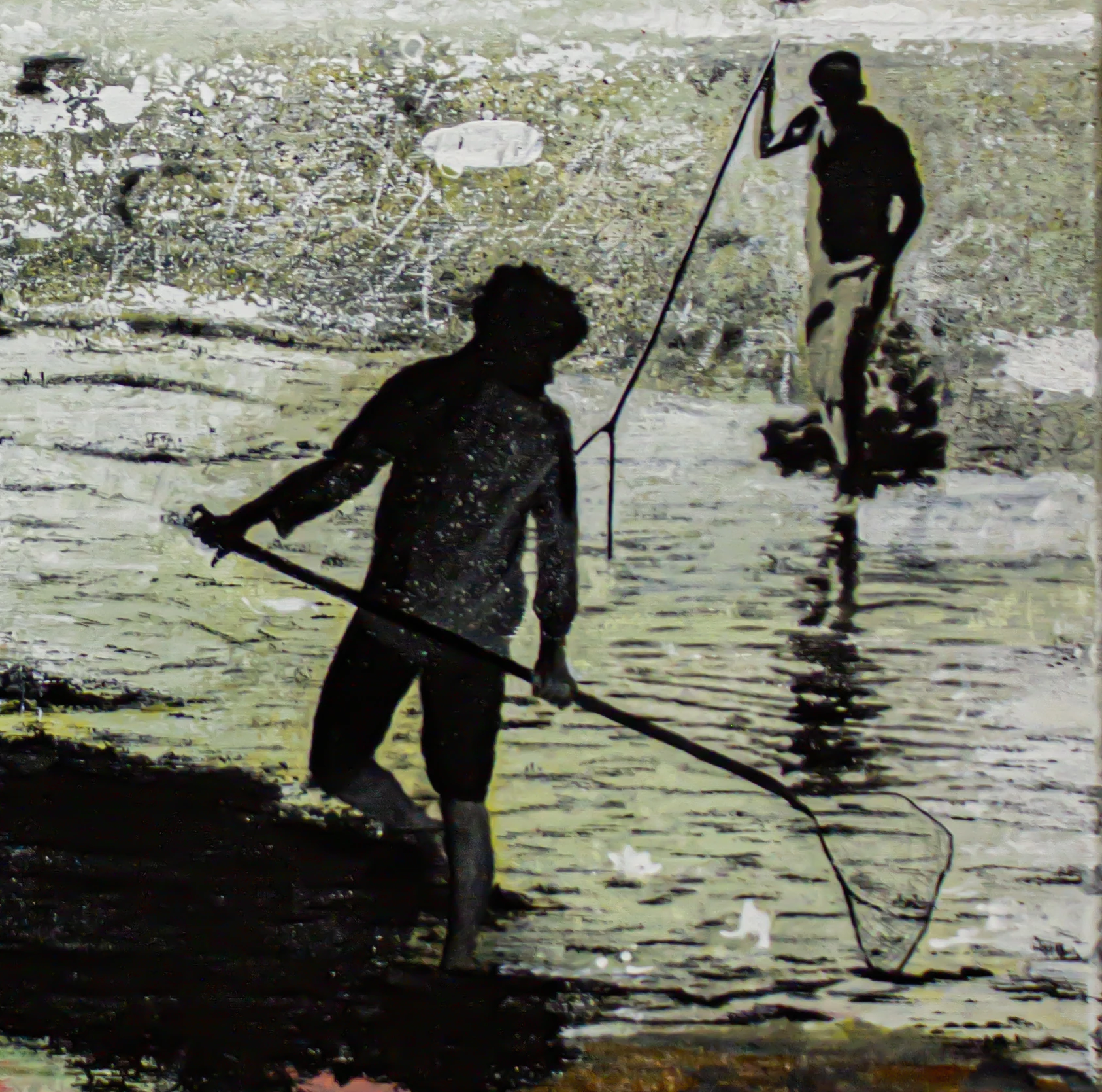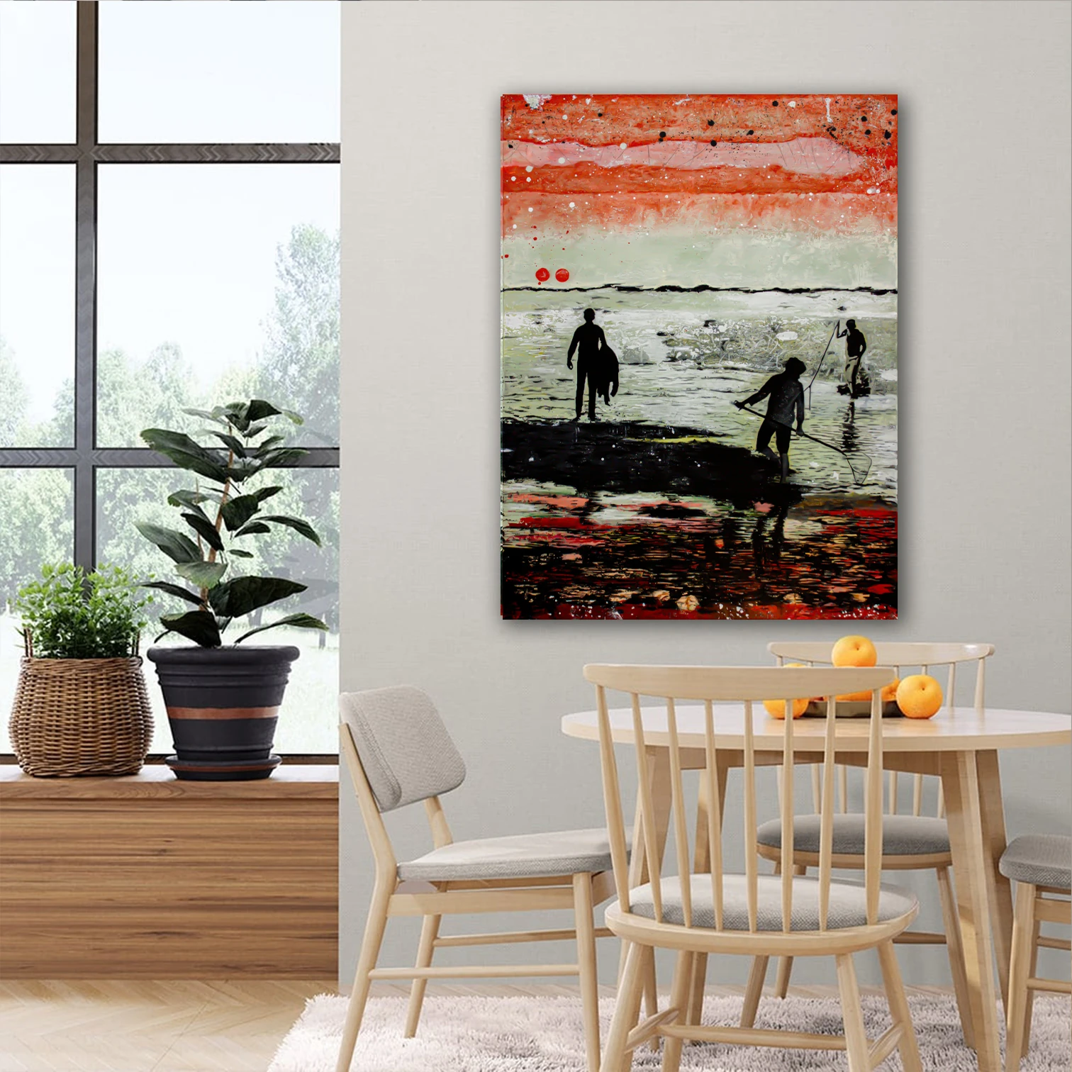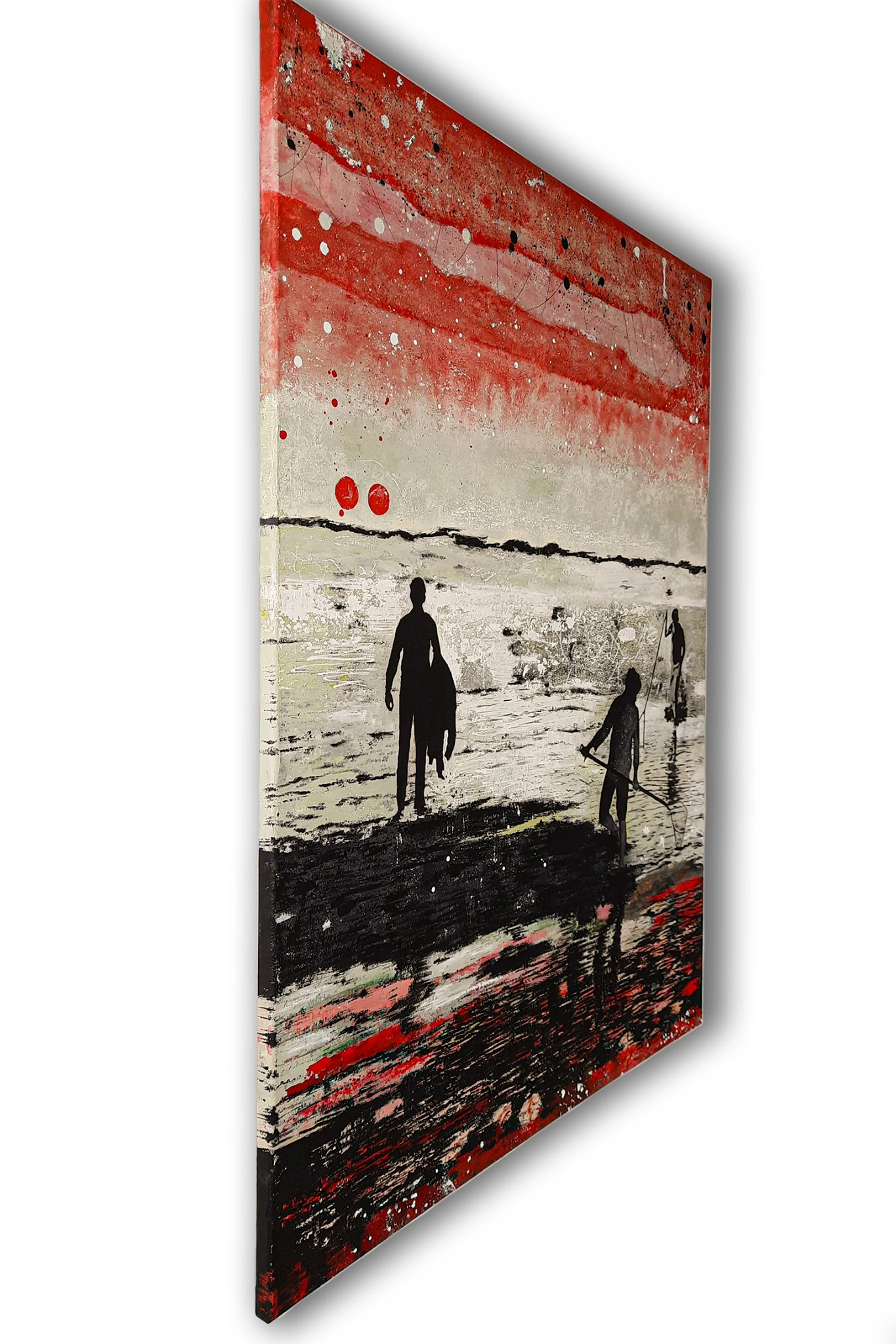 Measuring an impressive 120 x 90 x 2 cm, this artwork invites viewers into a world where silhouettes of friends are bathed in the reflective glow of a vibrant, textured shoreline.The layered hues of red, orange, and white in the sky seamlessly blend with the reflective waters below, creating a dynamic and nostalgic landscape. Waterman’s technique masterfully combines acrylics, oil, pencil, and collage to craft an immersive composition. The rich textures and abstract layering reflect her dedication to capturing the depth and transparency of emotion, reminiscent of watercolor effects. The silhouettes of the figures against the vivid backdrop highlight the camaraderie and simplicity of moments shared by the sea, while the reflective ripples evoke both a sense of tranquility and energy. Ideal for large spaces such as living rooms, dining areas, or gallery exhibitions, "Buddies" is an evocative addition that brings warmth, depth, and the essence of shared memories into any setting.