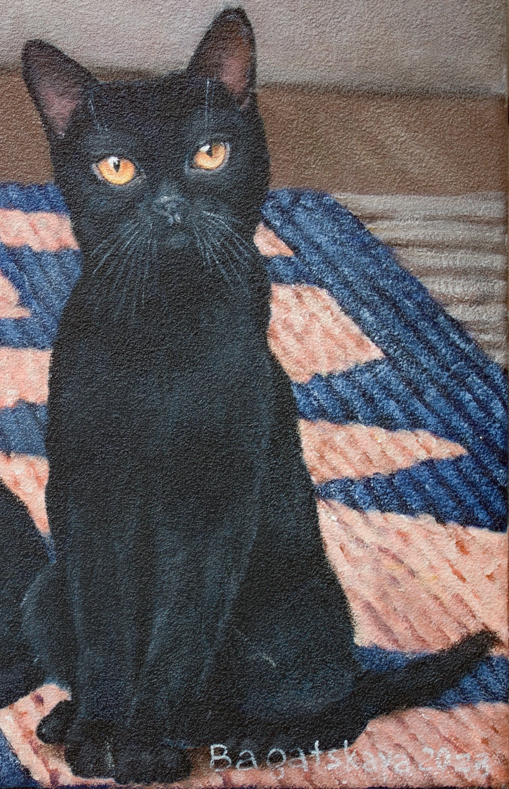 The meticulous attention to detail in the floral patterns and the cats expressive gazes speaks to Bagatskaya's expertise in realism and photorealism. The dominant interior theme complemented by a vibrant yet subdued color palette of blues blacks and the warm glow of the fire creates a cozy and inviting atmosphere.