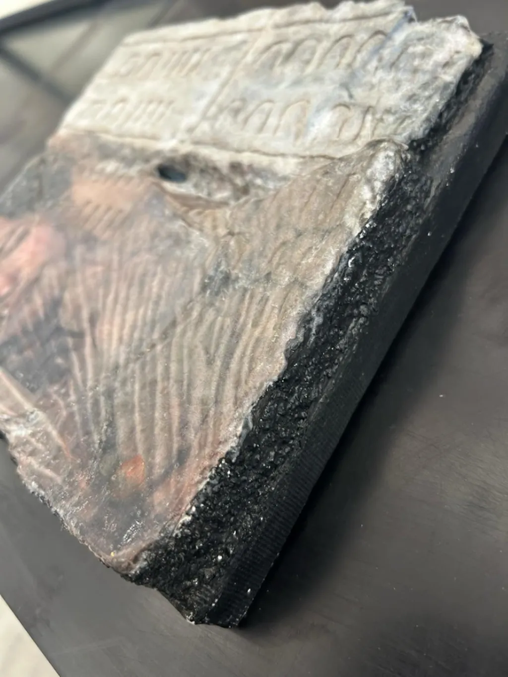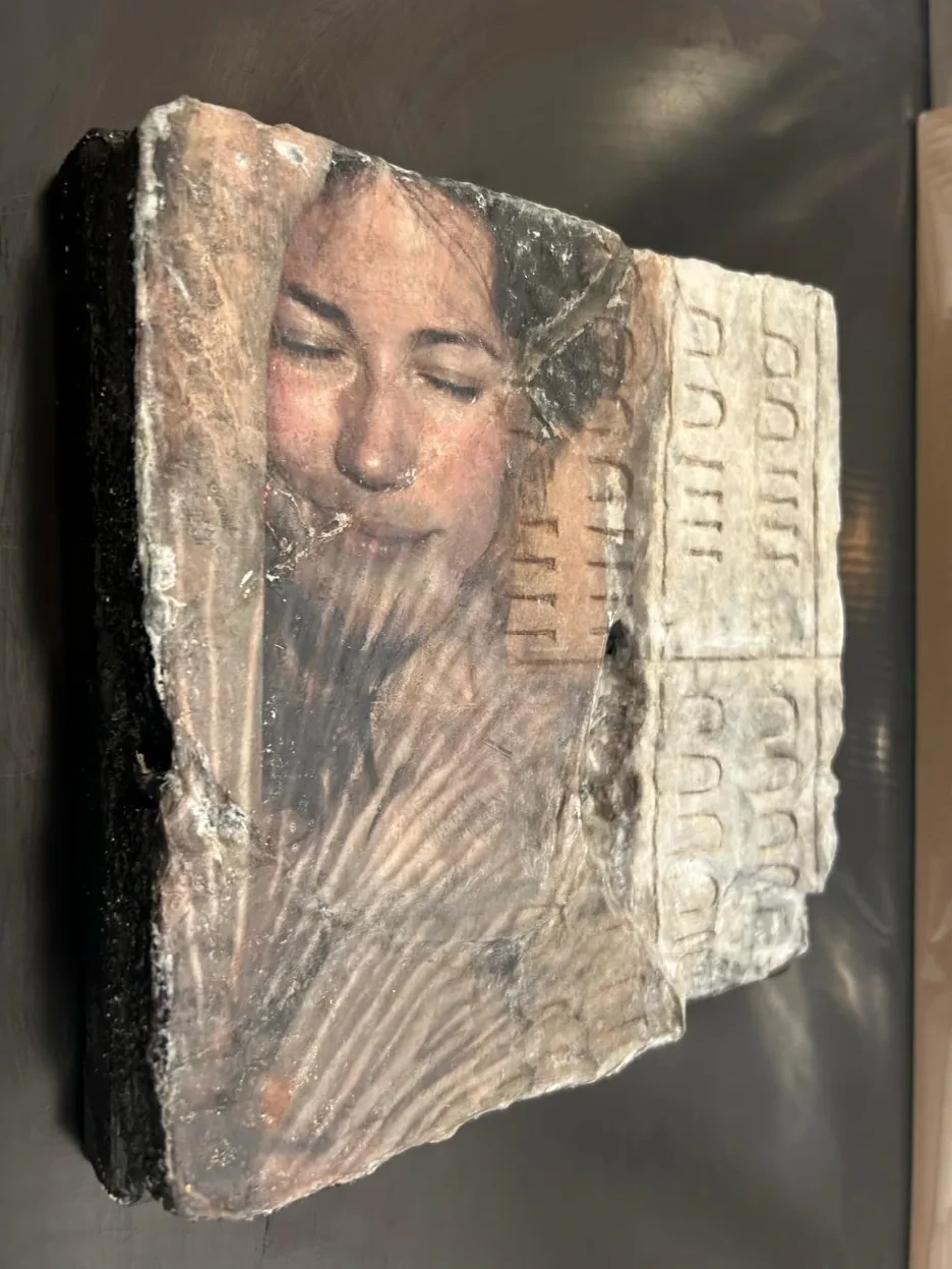The painting leans into a figurative and conceptual style, with the subject partially veiled by time and touch. The dreamlike quality is enhanced by the soft interplay of color and material, lending the work an ethereal and tranquil atmosphere. It feels as if the viewer has stumbled upon a quiet memory embedded in stone or sand—reflective of the title’s allusion to “Cairo,” a place steeped in history and mystery.