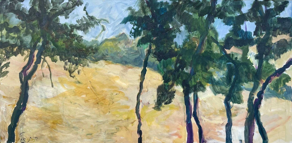 Measuring 140 cm x 70 cm, this vertical composition showcases Segal’s mastery in impressionism and abstract expressionism. The earthy and bright palette of greens, beiges, and blues, with hints of purple and yellow, captures the warmth and serenity of nature in harmony.