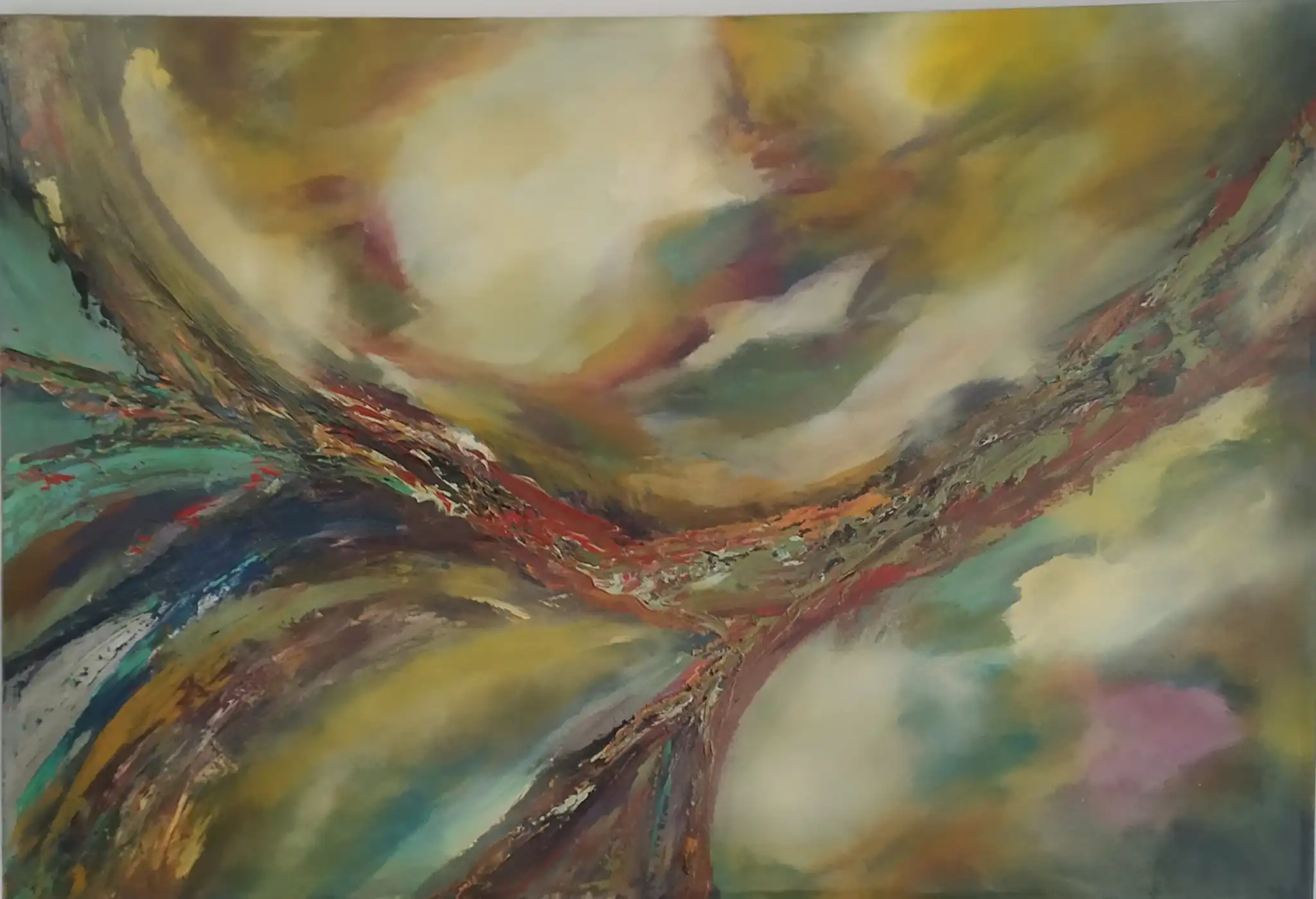 Briceño’s use of color and form creates a harmonious balance between movement and stillness, inviting viewers to explore the ethereal beauty of this abstract interpretation of heavenly paths. The layered brushstrokes and blended colors evoke a sense of depth and mystery, as if one is looking into a transcendent landscape that stretches beyond the confines of the canvas. The title "CAMINOS DEL CIELO" (Paths of the Sky) hints at the spiritual and contemplative nature of the work, encouraging viewers to reflect on the connections between the physical and the metaphysical.