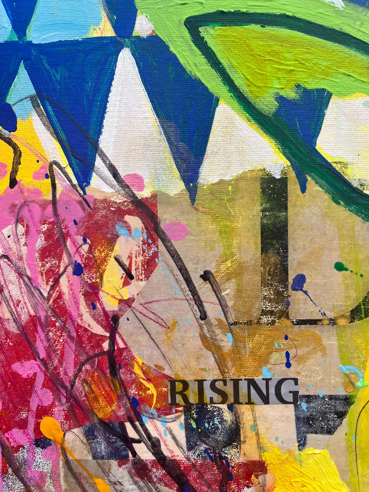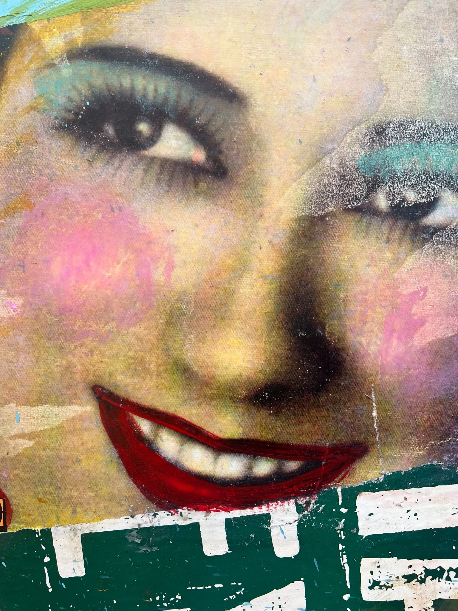 This Pop Art and fantasy-themed piece blends collage, painting, and text, offering a dreamlike experience full of color, movement, and joy. The artist’s signature mixed media technique transforms this vertical canvas into a field of imagination where reality and dreams meet.
