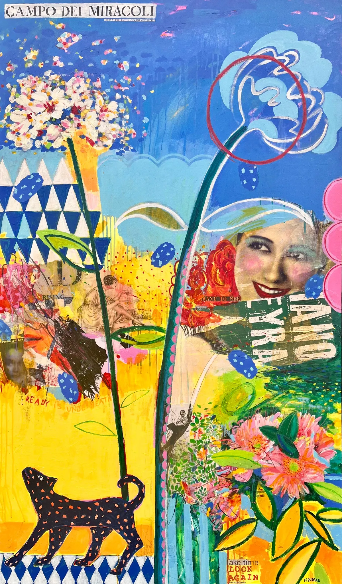 Campo dei Miracoli is a large-scale mixed media masterpiece (170 x 100 cm) by María Burgaz, celebrating a vibrant world of floral fantasy, playful typography, and layered symbolism.