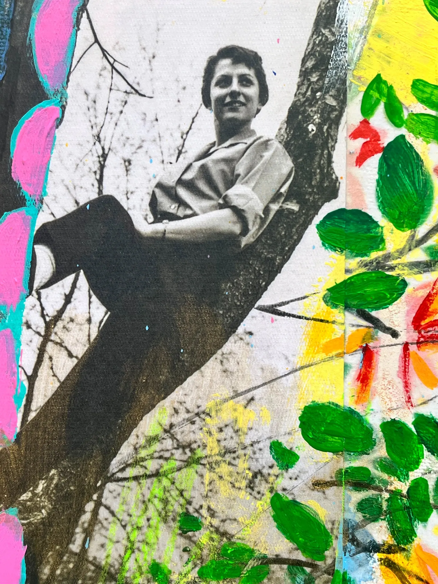 Bursting with vivid hues and eclectic imagery—from blooming flowers to vintage faces and a dotted black panther—the artwork invites a sense of whimsy and inspiration.