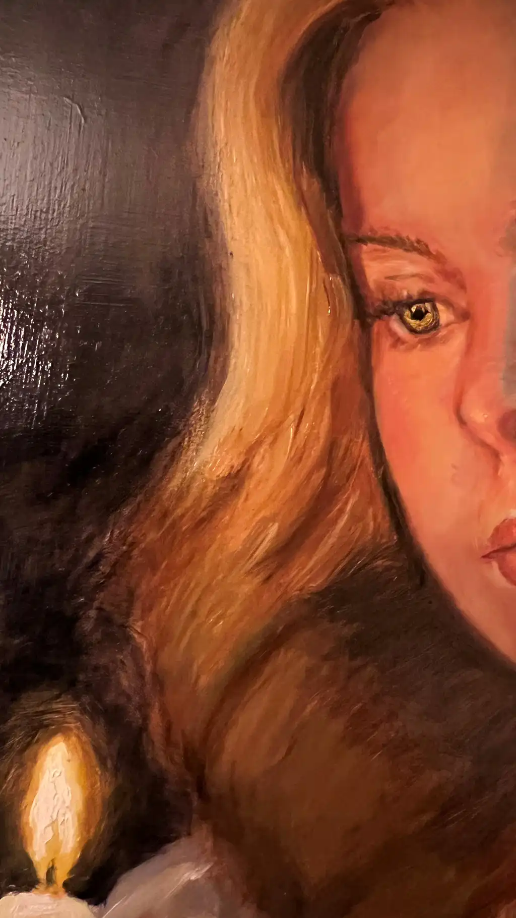 his painting, crafted in 2023 using oil on a wooden panel, measures 90 x 60 cm and evokes a serene, reflective atmosphere. The scene centers around a single candle, whose flame casts a gentle glow that illuminates its surroundings with a rich, warm palette, emphasizing shades of amber, gold, and subtle reds. The dark background contrasts with the flame, drawing the viewer’s eye to its delicate, flickering light and creating a mood of quiet introspection. Gruiters, celebrated for her ability to render fine details, has imbued this piece with a sense of romantic intimacy and calm reflection. The soft brushwork and careful attention to light play with Realism, immersing the viewer in a moment of solitude and tranquility. The timeless appeal of this work makes it an ideal addition to spaces like a bedroom, study, or hallway, where it can serve as a focal point for relaxation or contemplation. "Candlelight Flame" embodies Gruiters’ dedication to portraying emotion through light, making this artwork a captivating addition to any collection.
