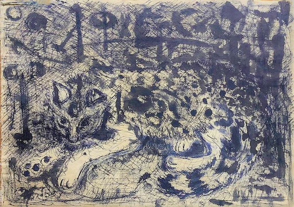 Created with ink and watercolor on paper, this 40 cm × 60 cm artwork radiates energy through a dynamic interplay of deep blue hues and fluid, spontaneous brushwork. The cat emerges from a chaotic yet deliberate composition, its curious gaze and poised stance reflecting both mystery and movement.