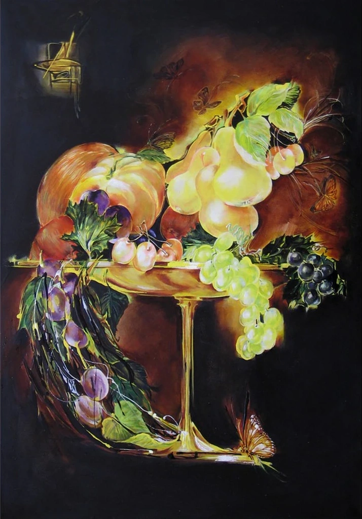 Nady Gepp, an internationally recognized artist with an extensive exhibition history across Europe and the USA, is known for her ability to merge realism with artistic storytelling. "Cat - Dessert" is a testament to her mastery, transforming simple fruit arrangements into a visual feast of sensory delight and indulgence.
