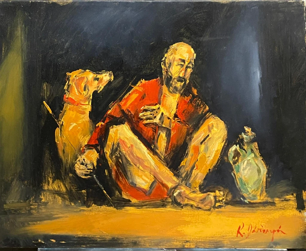 The composition centers on a seated man, draped in red, his expression marked by introspection. Beside him, a loyal dog gazes attentively, adding a layer of companionship amidst the solitude. The light and shadow, accentuated by muted yellow highlights, create a moody, emotional atmosphere, reminiscent of the expressive works of Corneliu Baba.