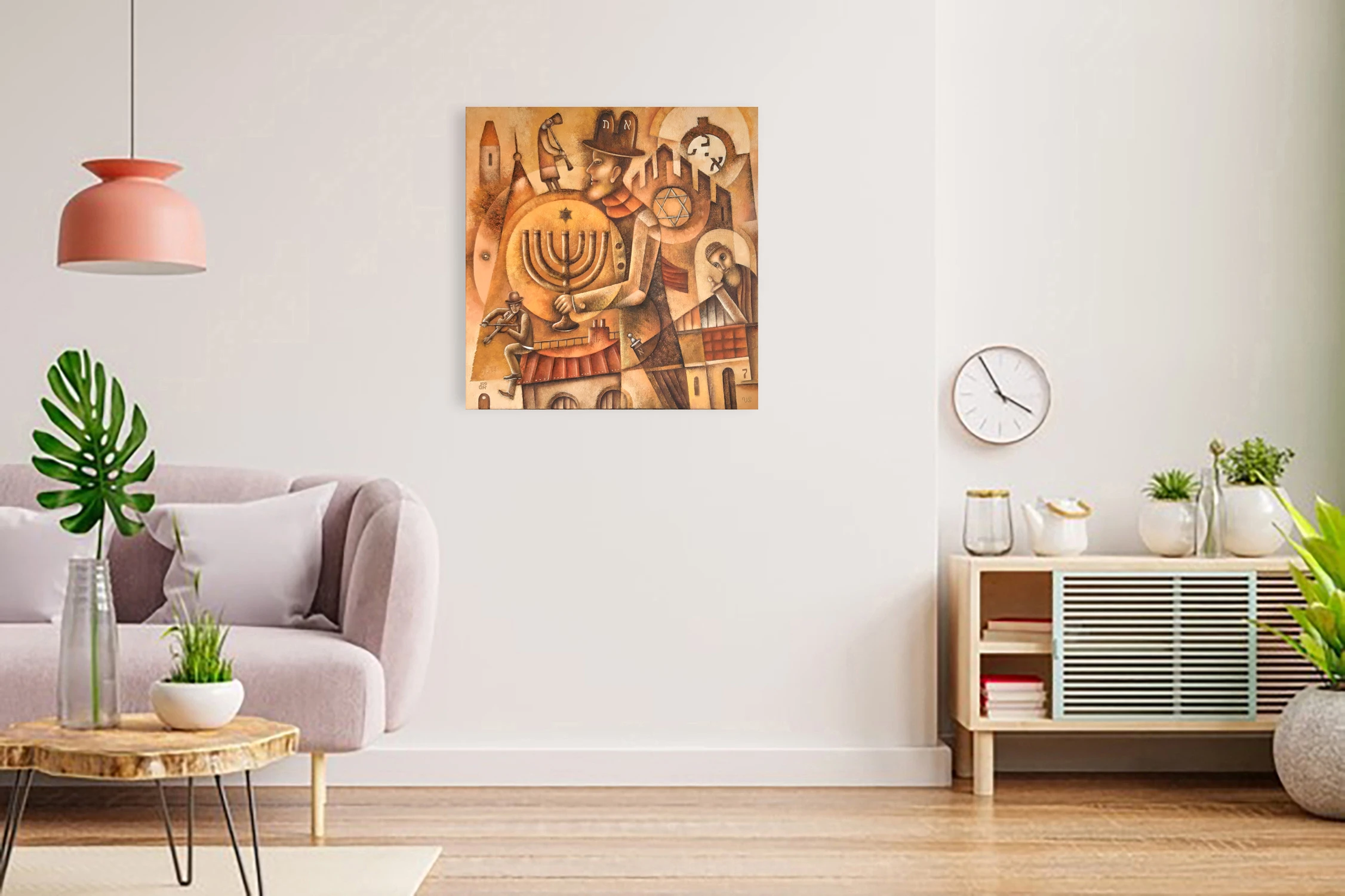 Ivanov's use of warm, earthy tones and bold brushstrokes evokes a sense of spiritual warmth and historical depth, inviting viewers to contemplate the interplay of light and shadow. The menorah, a traditional symbol of illumination and wisdom, stands prominently against an abstract urban backdrop. The surrounding circular patterns create a dynamic effect, mimicking the flicker of candlelight and the halo-like glow of streetlights. This unique combination of cubist elements and cultural motifs makes "Circles of Light" a compelling piece for various settings, whether as a centerpiece in a living room or an inspirational addition to an office or gallery. Ivanov's mastery in blending modernist techniques with symbolic storytelling is evident in this artwork, making it a remarkable addition to any contemporary art collection. Its vibrant palette and layered composition invite viewers to discover new details with every glance, providing both visual interest and deep meaning.