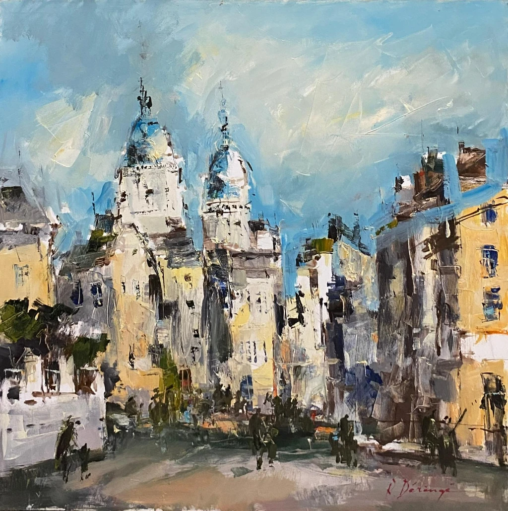 Painted in oil on canvas, this 63x63 cm work embodies Post-Impressionism, where architecture merges seamlessly with light and movement. The soft blue sky contrasts against the sunlit facades, while figures subtly emerge, evoking a nostalgic and timeless atmosphere. The textured strokes and dynamic composition transport the viewer into a world of both realism and abstraction, making it ideal for spaces such as a living room, office, hallway, or art gallery.
