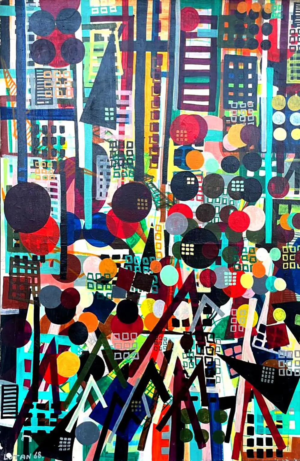 "City Symphony" by Yona Lotan, created in 1968, is an abstract representation of urban vibrancy. Measuring 80 cm by 119.5 cm, the artwork showcases a lively interplay of geometric shapes and a myriad of colors, reflecting the dynamic and chaotic nature of city life. The dominant hues include red, yellow, green, blue, and black, arranged in a complex, harmonious pattern. The consistent lighting highlights the vividness of the colors and the boldness of the shapes. The style is abstract, emphasizing form and color over realistic representation. The painting evokes feelings of excitement and curiosity, making it suitable for modern living rooms, offices, or conference rooms, where its energetic nature can inspire and captivate.